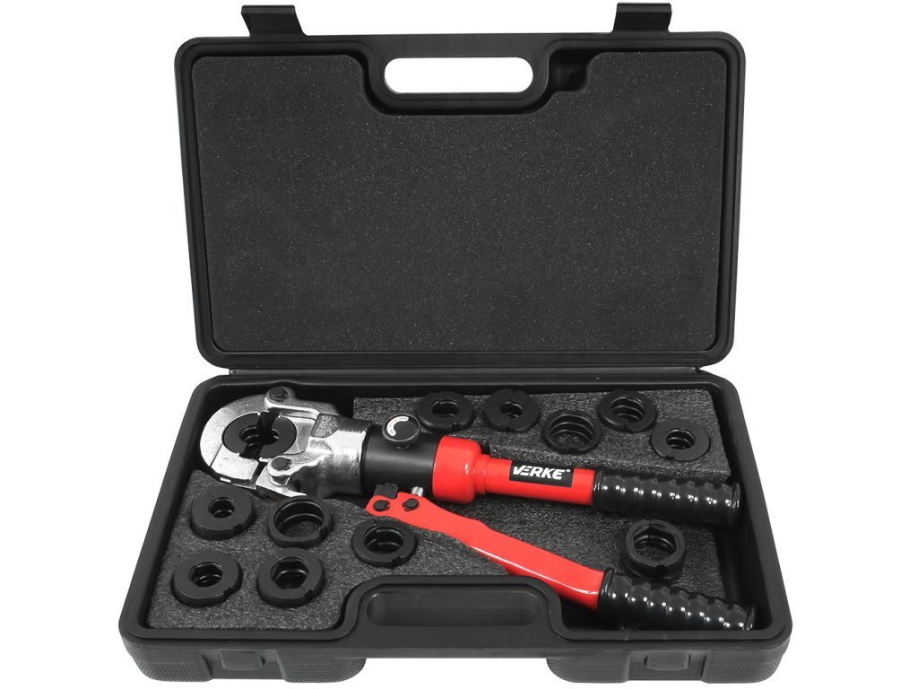 Хидравлични клещи за PEX тръби U+H+V VERKE V86261 са професионален инструмент, предназначен за свързване на пластмасови PEX тръби (свързан полиетилен) чрез специални скоби. Тези скоби се използват широко в санитарни и канализационни инсталации, системи за подово отопление, както и в отоплителни и охладителни системи.