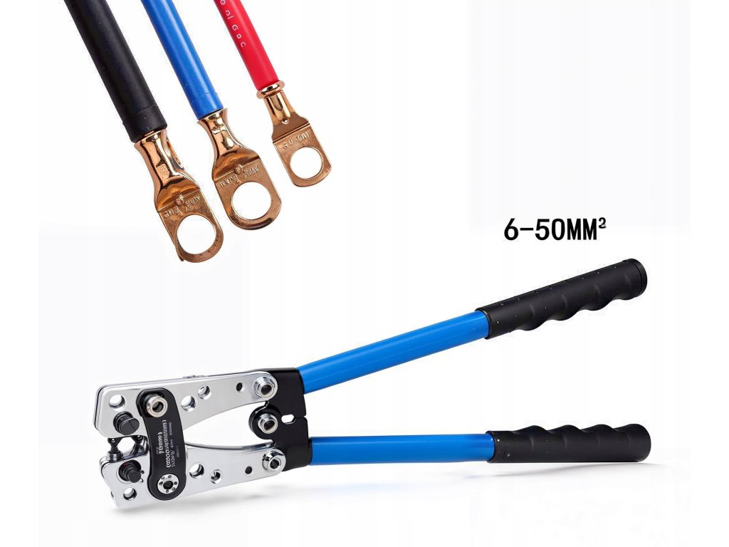 Професионални Клещи за кримпване на кабели 6-50 мм с шестограмни челюсти, перфектният инструмент за прецизно и надеждно кримпване на крайни кабелни накрайници с диапазон 6–50 мм². Заради здравата конструкция от закалена инструментална стомана и ергономичния дизайн, те са подходящи за електротехници, сервизни техници, механици и домашни майстори.