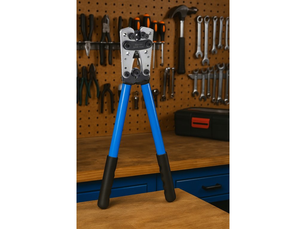 Клещите са пригодени за накрайници от мед и алуминий, като осигуряват бързи и надеждни съединения на проводници чрез шестостенна (HEX) кримпваща матрица. Механизмът с двойни ергономични ръкохватки осигурява висока сила при минимално усилие.