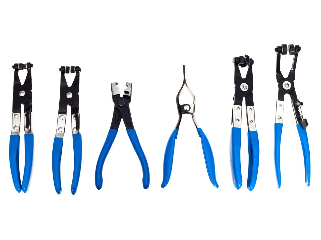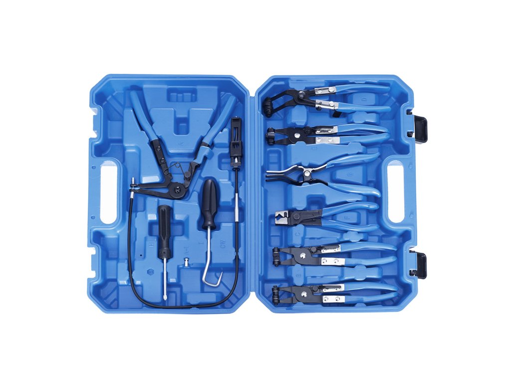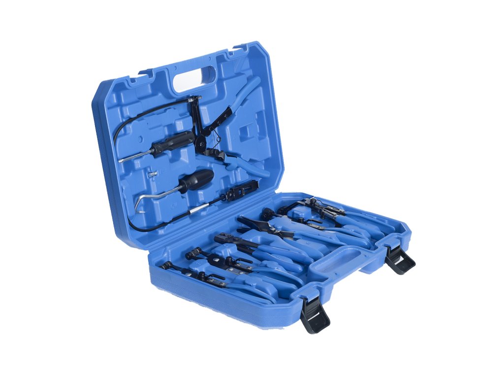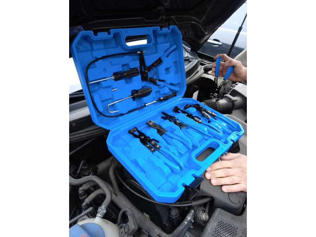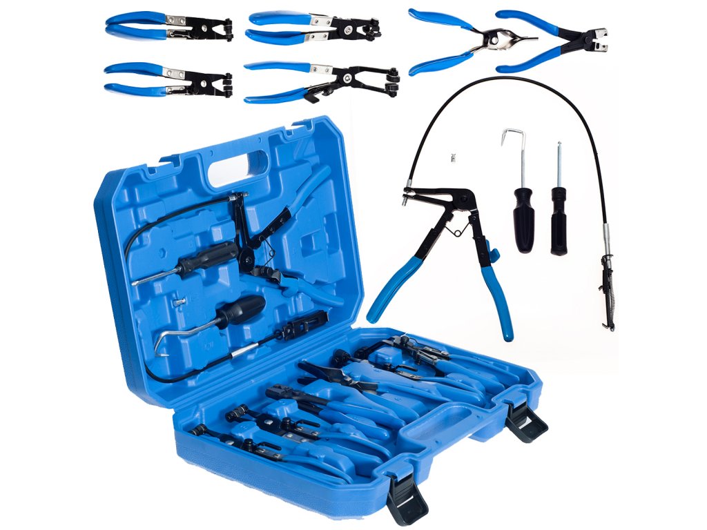 Един от най-добрите комплекти клещи за скоби на пазара, който гарантира комфорт при работа в автосервизи или домашни работилници. Всички елементи са изработени от висококачествени материали. Клещите с завъртащи се челюсти са проектирани за повечето видове гъвкави предпазни ленти, оборудвани със завъртащи се челюсти с прорези за оптимално захващане на големи и малки скоби под всякакъв ъгъл. Заключването с лост позволява задържане на челюстите в пет различни позиции за сигурно захващане на опънатата лента.
