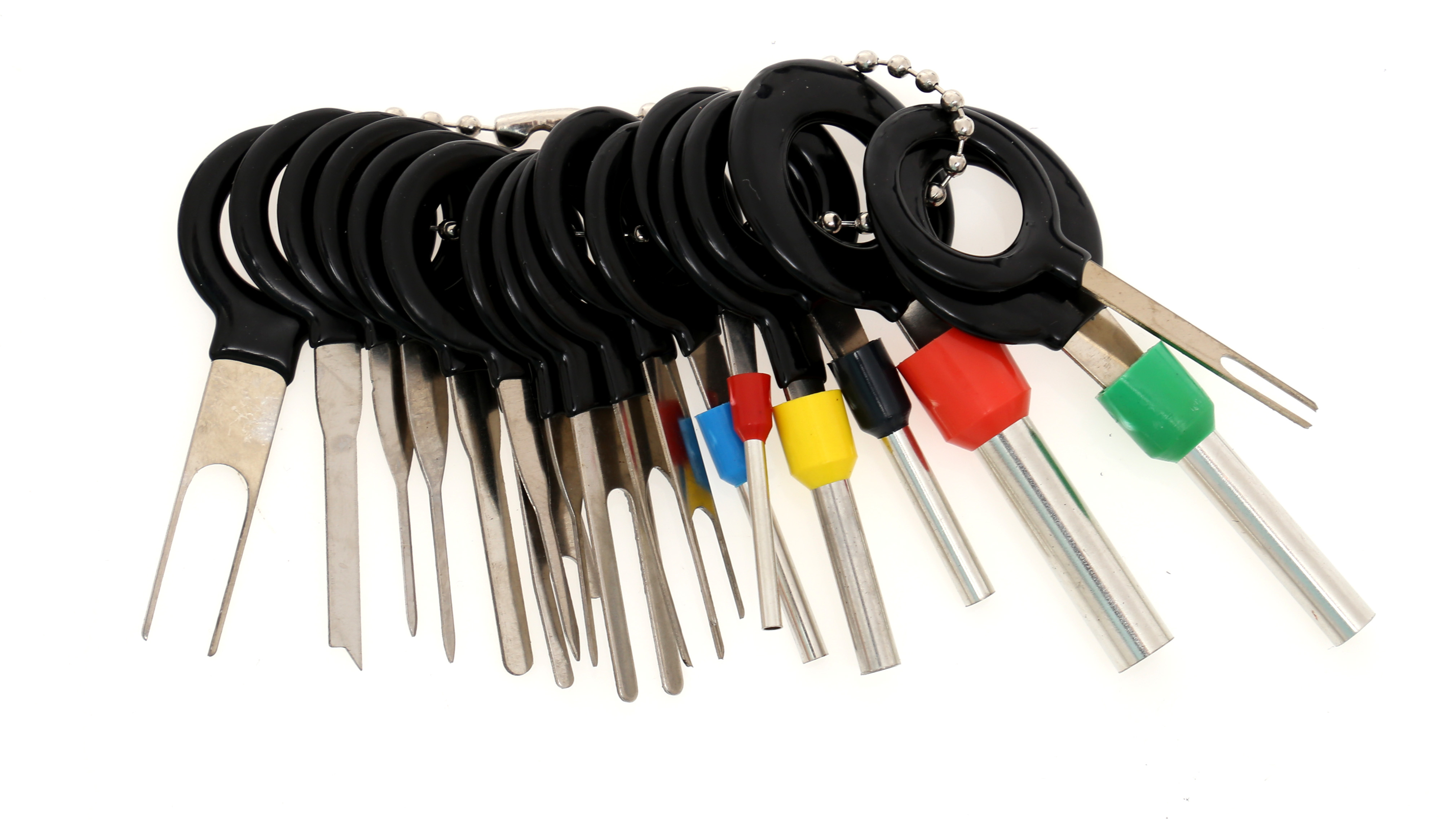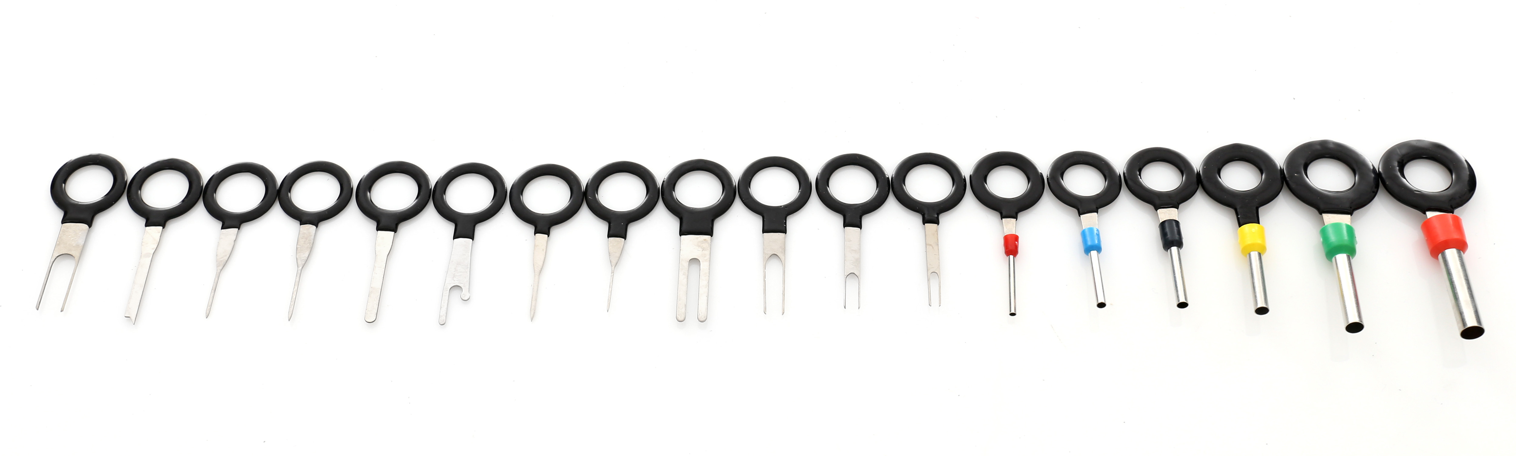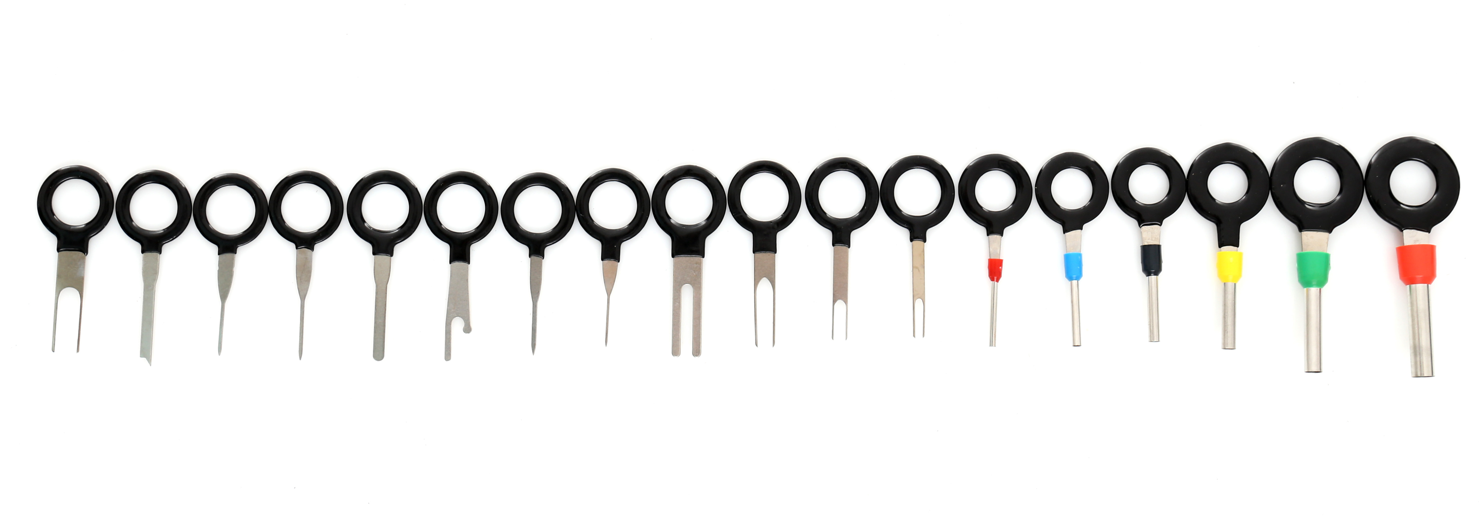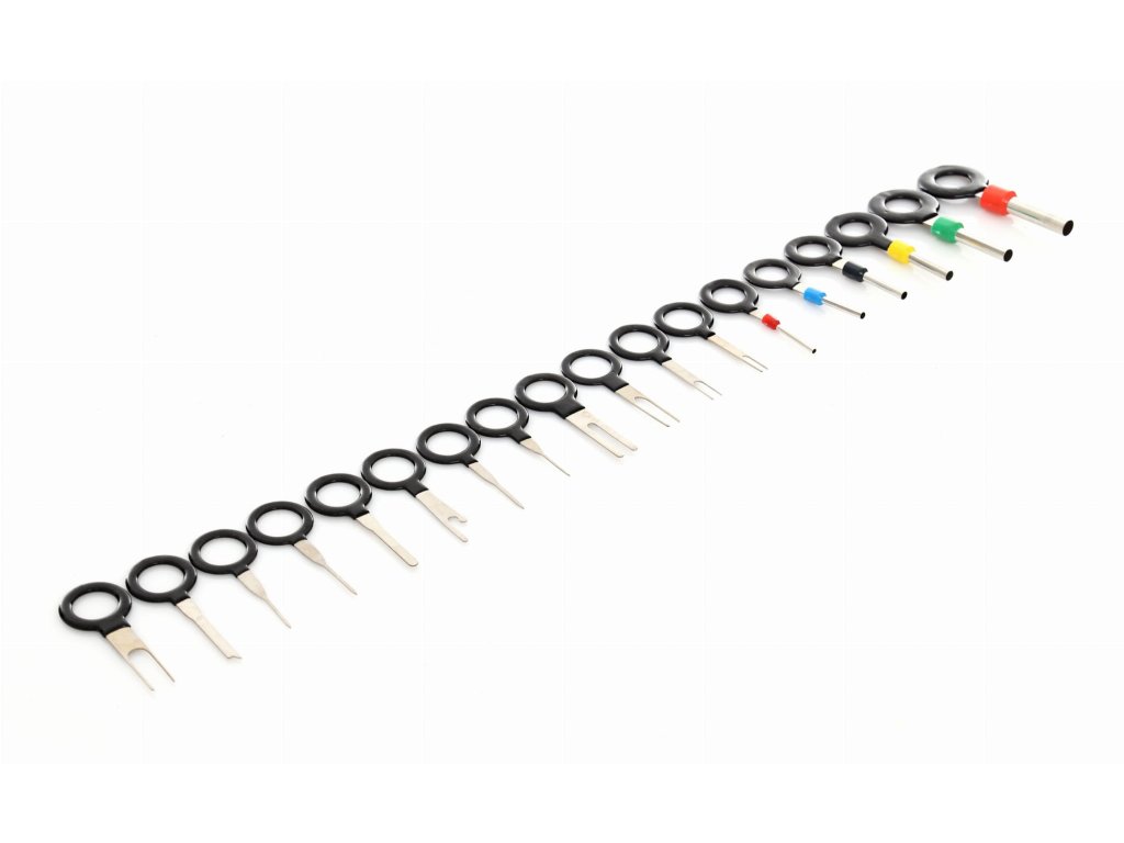 Комплект от 18 бр. ключове за демонтаж на щифтове и конектори. Дръжката е покрита с гума, което повишава комфорта по време на работа. Този комплект е незаменим инструмент за всеки електротехник или електронник. Изключително полезен е при модификации и ремонти на електрически инсталации в автомобили, мотори, лодки, както и вкъщи при ремонт на домакински уреди, аудио- и видеотехника или компютри. Разглобителите имат ергономична форма, благодарение на която демонтажът става много лесен. Може да се работи и с счупен щифт или огънат контактен пластинен конектор. И най-важното – разглобителите не повреждат щифтовете.