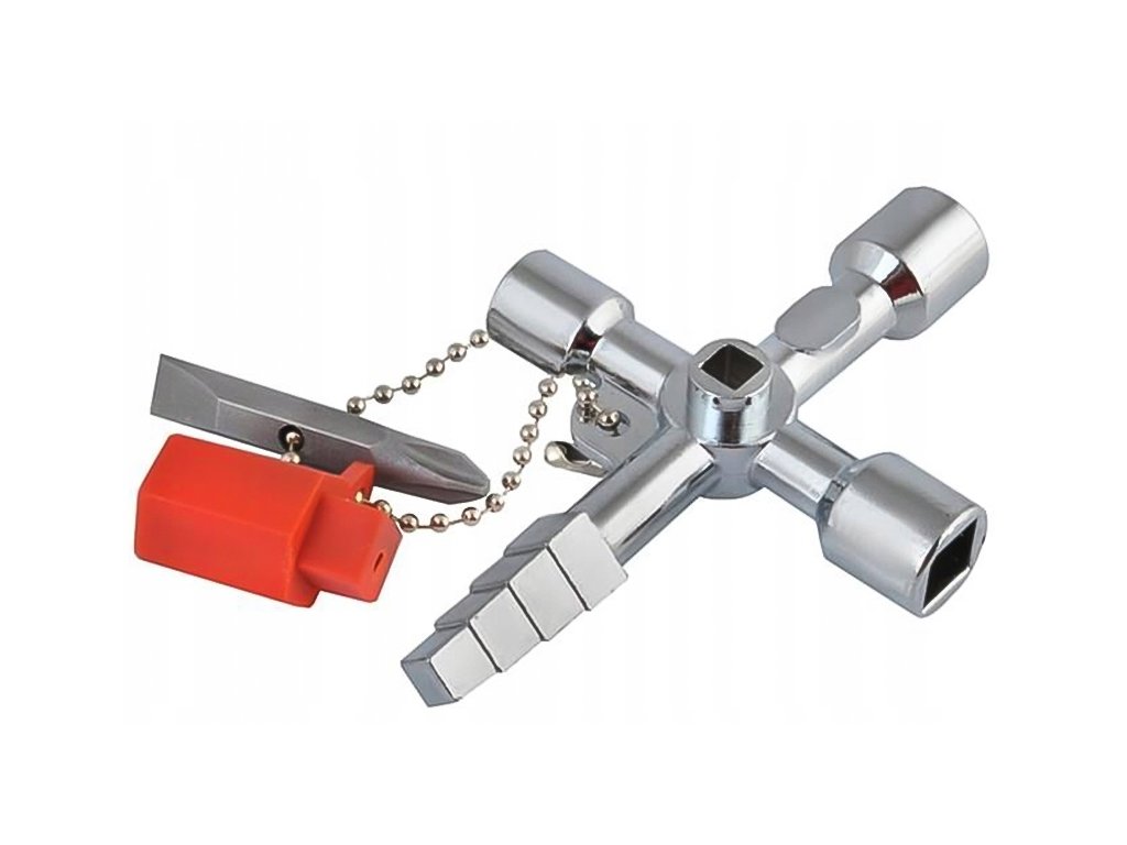 Този ключ с накрайници е предназначен за отваряне и затваряне на повечето технически шкафове и разпределителни кутии (отопление, електротехника, санитария). В комплекта е включен верижка с адаптер и двустранен бит – плосък и кръстат.