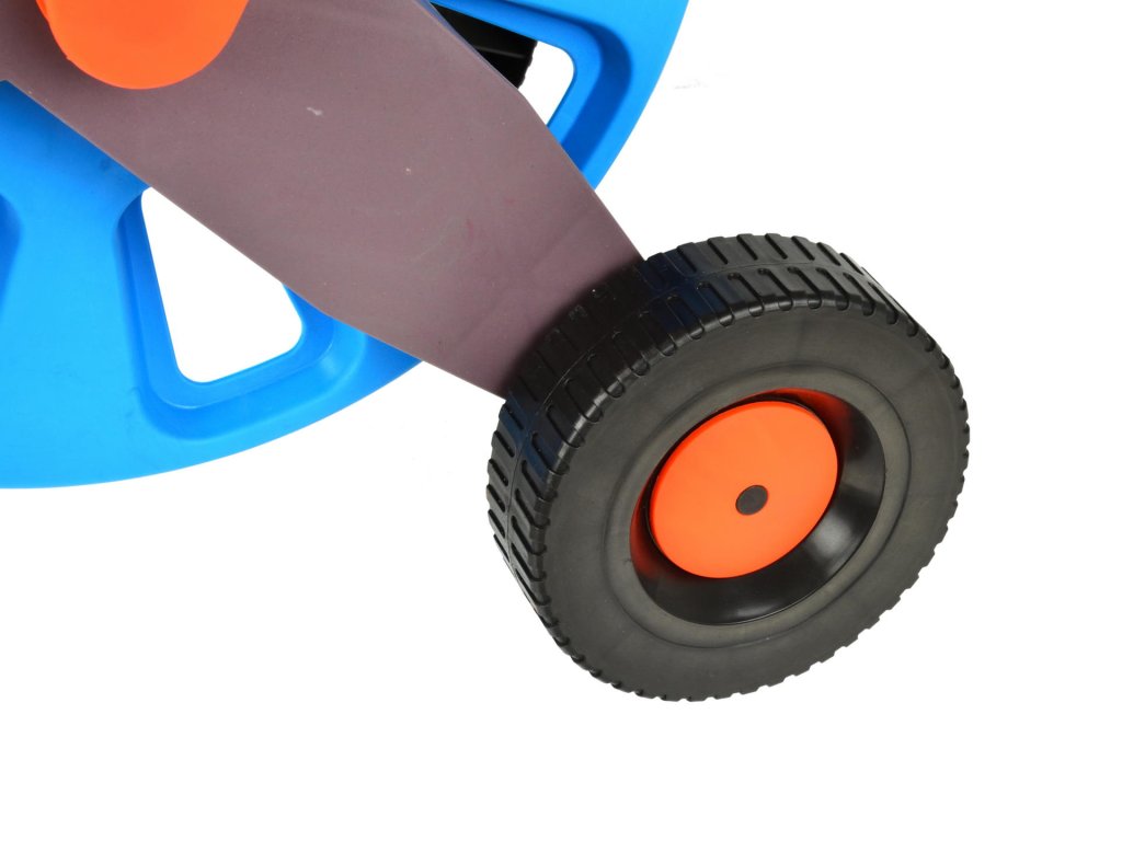 Сред основните характеристики на продукта са вращащ се конектор, който предотвратява усукването на маркуча, и метални тръби със защитно антикорозионно покритие, осигуряващи дълготрайна издръжливост на количката. Количката е оборудвана и с транспортни колела, които улесняват придвижването ѝ в градината. Височината на количката е 720 мм, което позволява удобно навиване и размотаване на маркуча.