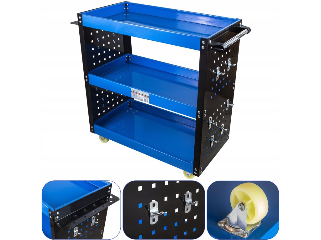 Тази практична работна количка за инструменти със стени и куки, 3 рафта с 12 куки е идеално решение за организиране и транспортиране на инструменти, работни части или материали. Благодарение на здравата стоманена конструкция, трите дълбоки рафта и въртящите се колела, количката е подходяща както за професионални ателиета, така и за домашни автосервизи.