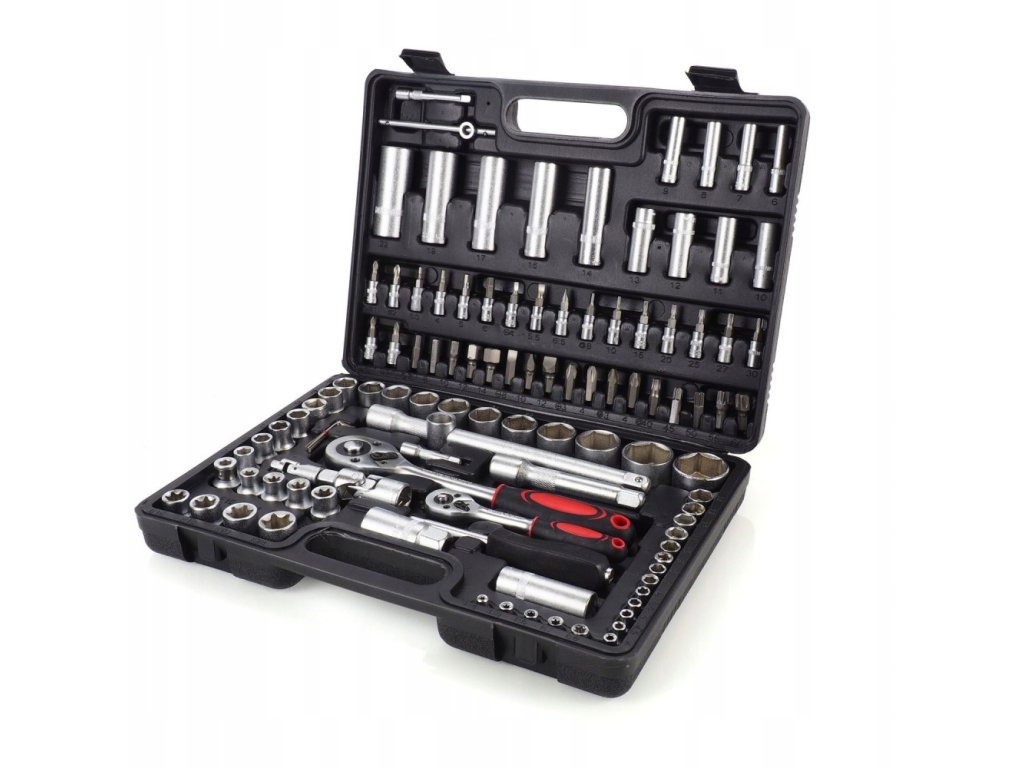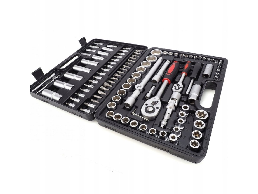 Комплектът включва широка гама от топ ключове, удължени вложки, битове и допълнителни аксесоари като трещотки, удължители и адаптери. Това осигурява покритие на всички стандартни нужди при механични и технически задачи.