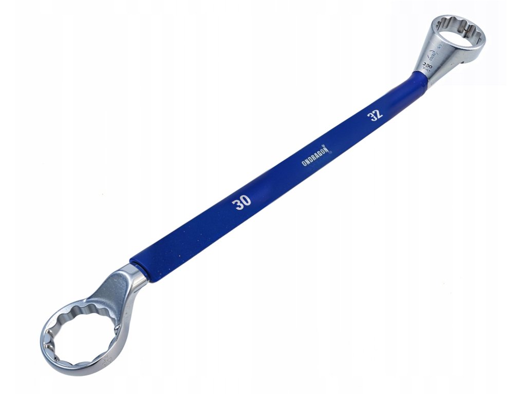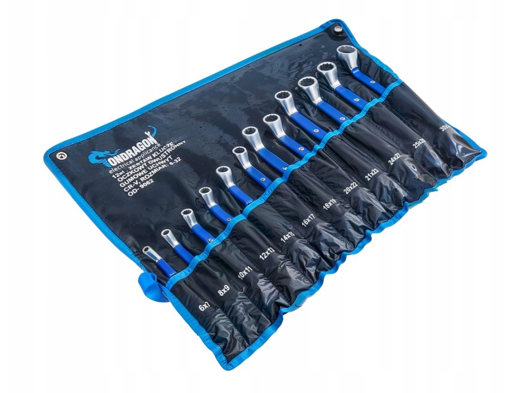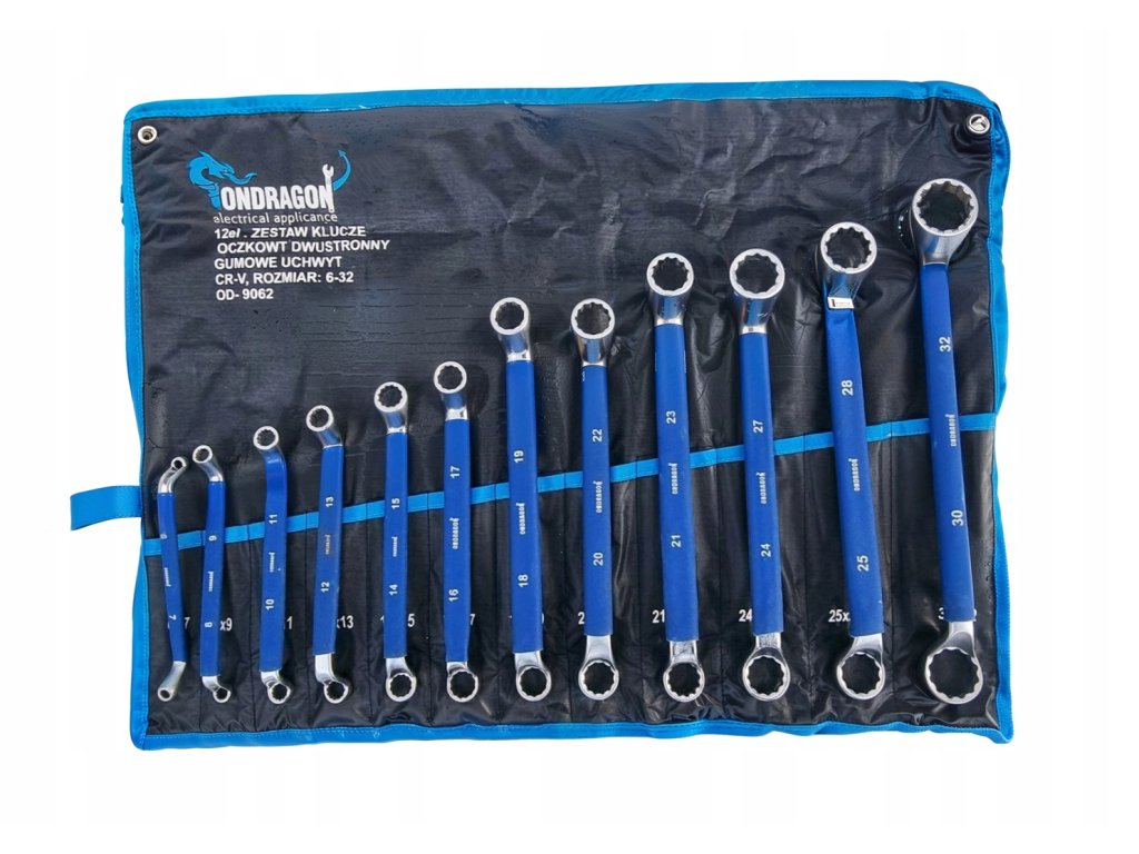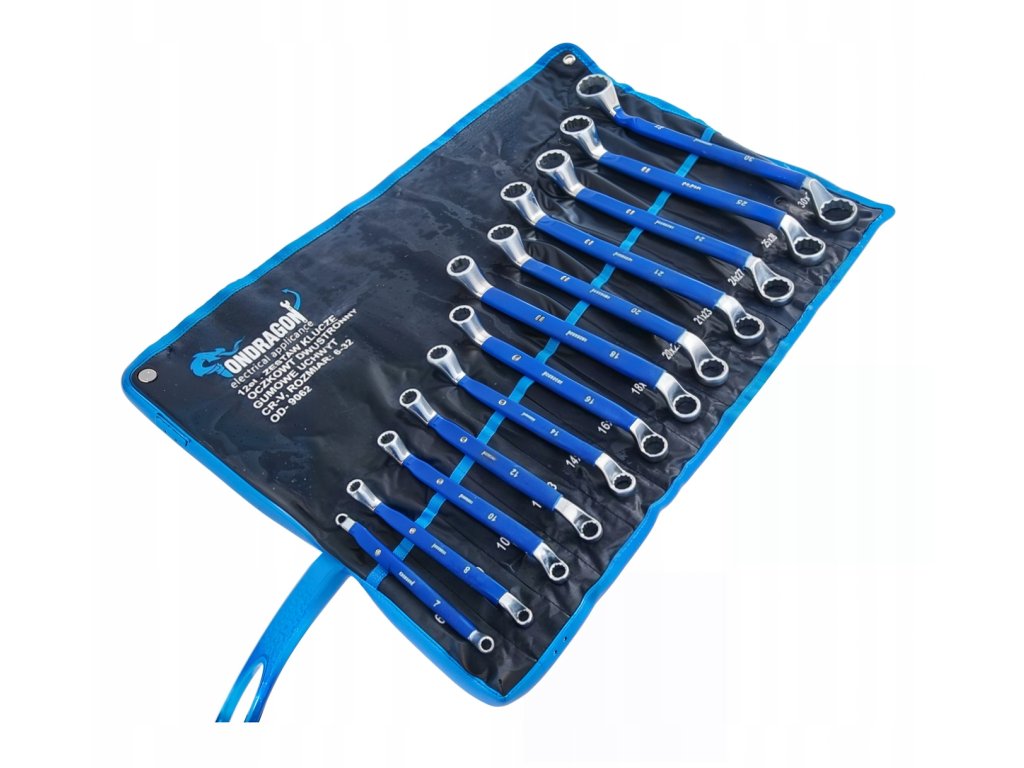 Висококачествен комплект от 12 двустранни звездогаечни ключове с извит дизайн, предназначен както за професионална, така и за интензивна употреба. Ключовете са изработени от здравата хром-ванадиева стомана, която гарантира максимална издръжливост и дълъг експлоатационен живот. Ергономичната гумена дръжка осигурява стабилен и удобен захват, минимизира риска от подхлъзване по време на работа и повишава безопасността. Ключовете са подредени в практичен калъф, който улеснява съхранението и пренасянето.