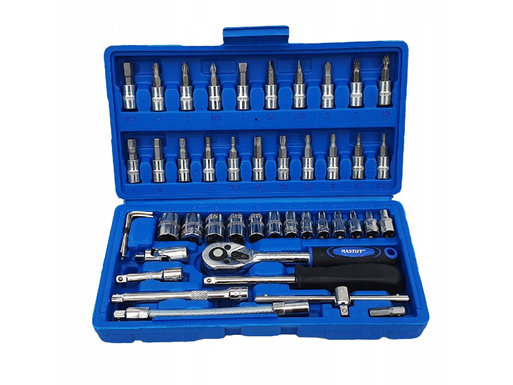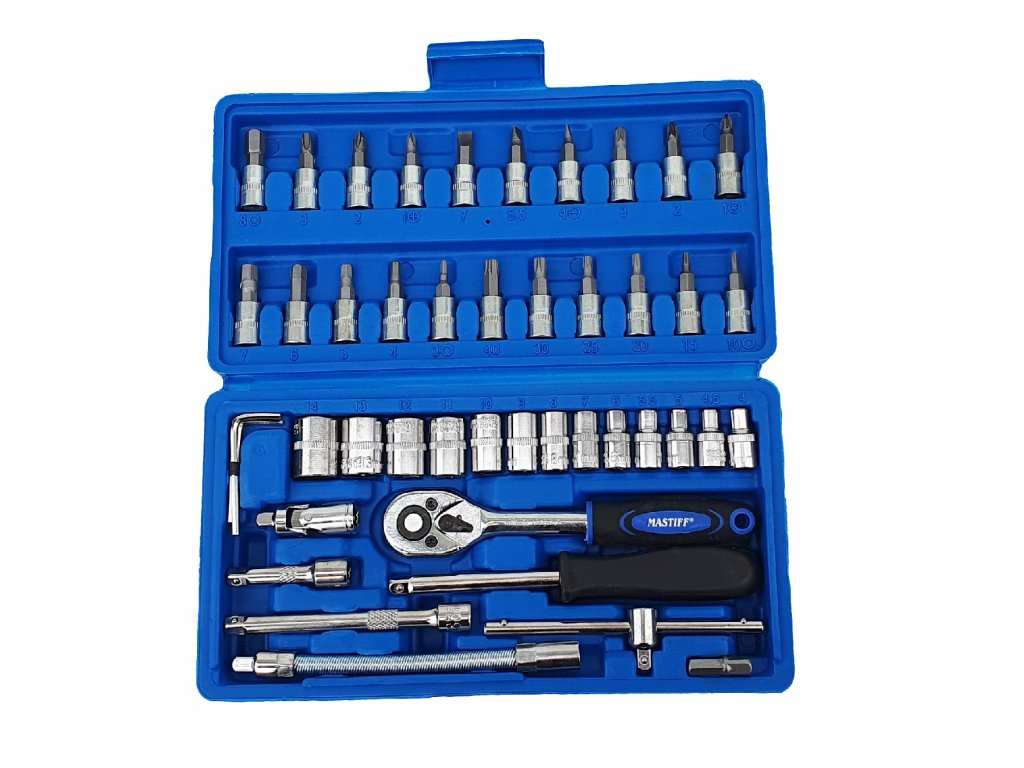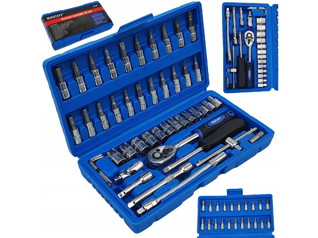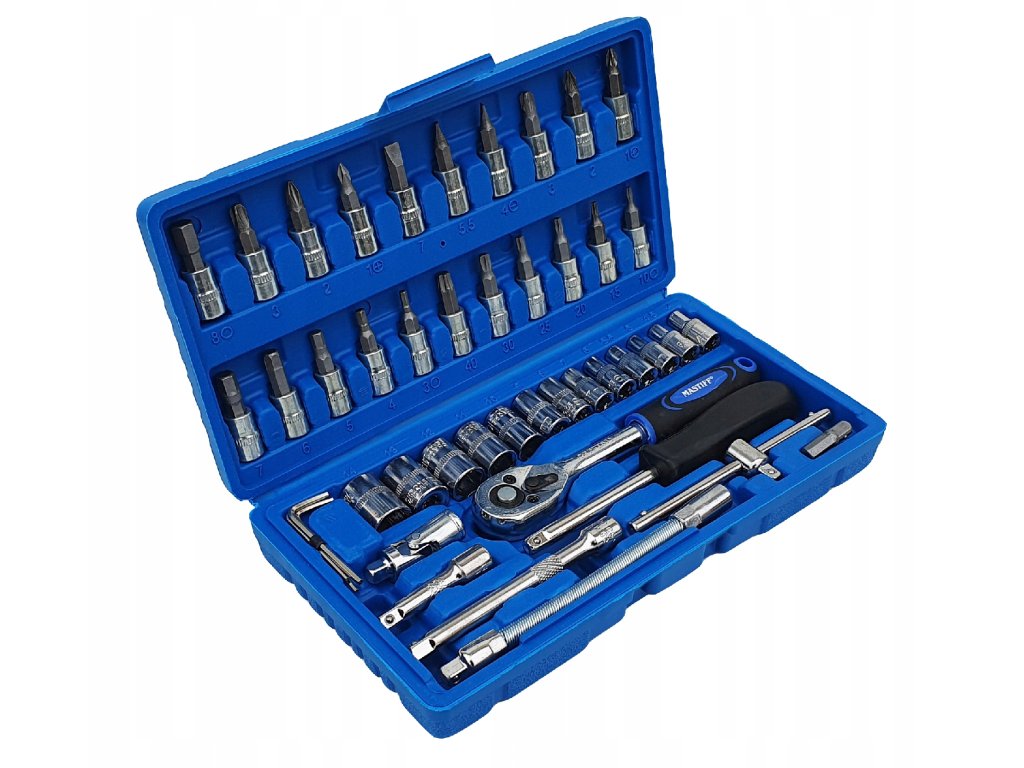 Комплект адаптери, ключове и битове 46 части е цялостен набор от вложки и битове, изработени от висококачествена хром-ванадиева стомана, която гарантира здравина и дълготрайност. Комплектът включва трещотка с издръжлив зъбен механизъм, различни размери вложки (от 4 до 14 мм) и богат асортимент битове (плоски, кръстачки, шестостенни, Торкс). В набора са включени също удължители, универсален шарнир, шестостенни ключове, T-образна ръкохватка и държач за битове.
