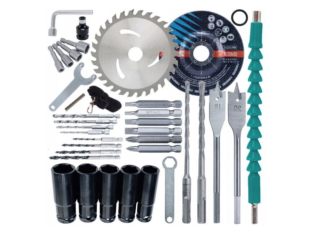 - Богат комплект аксесоари: битове, свредла, накрайници, HEX ключове, удължител