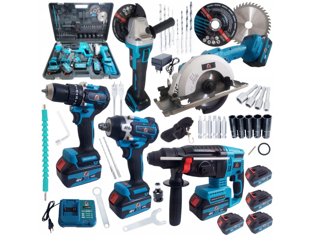 Комплект акумулаторни инструменти 5в1 с безчеткови двигатели - отвертка, чук, шлайфмашина, гайковерт, трион