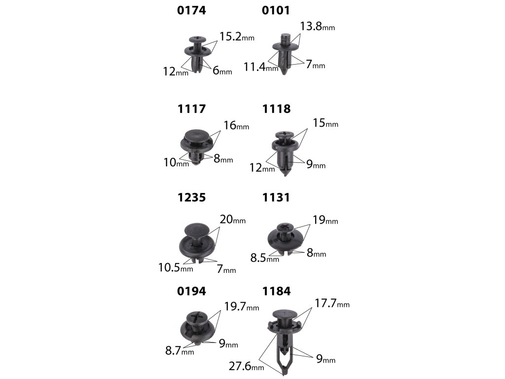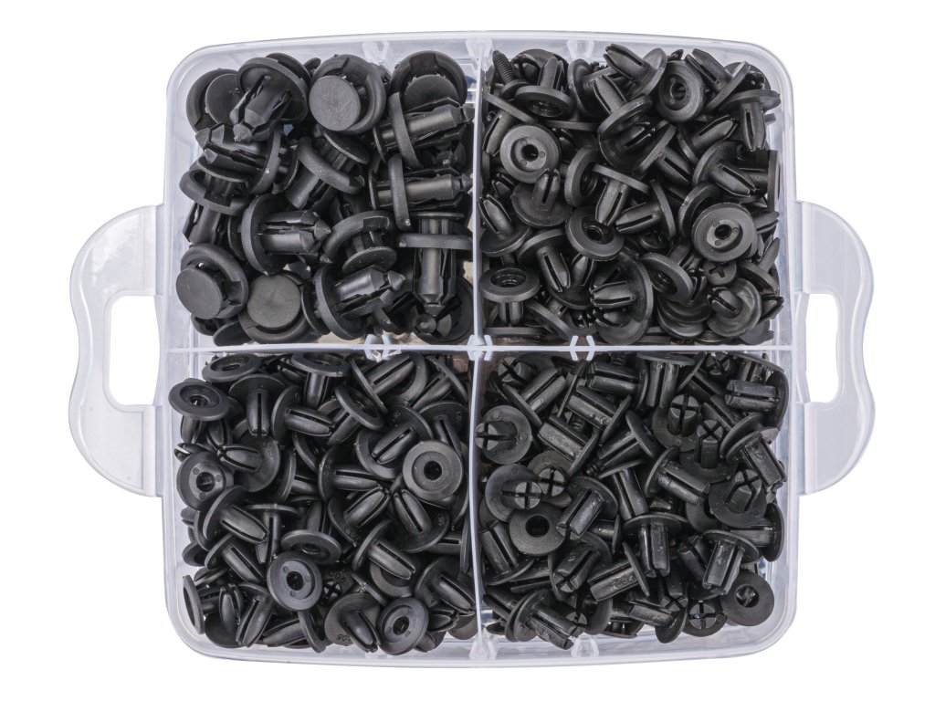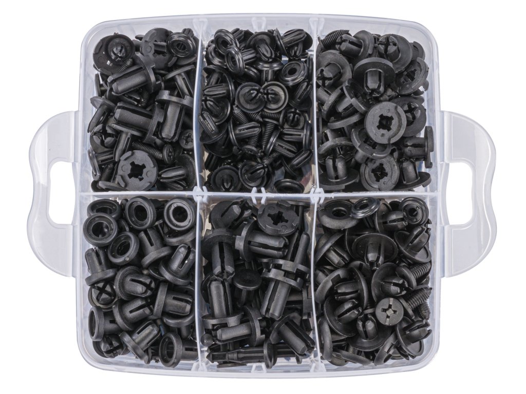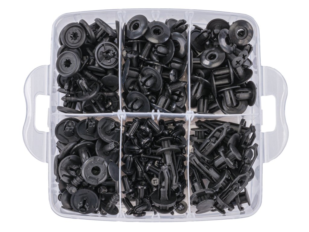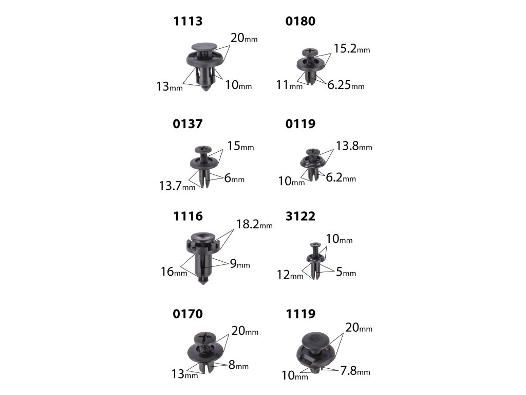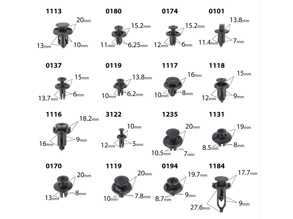 С този универсален комплект ще забравите за досадните проблеми с фиксирането на тапицерии, брони, калници и други пластмасови елементи на вашия автомобил!