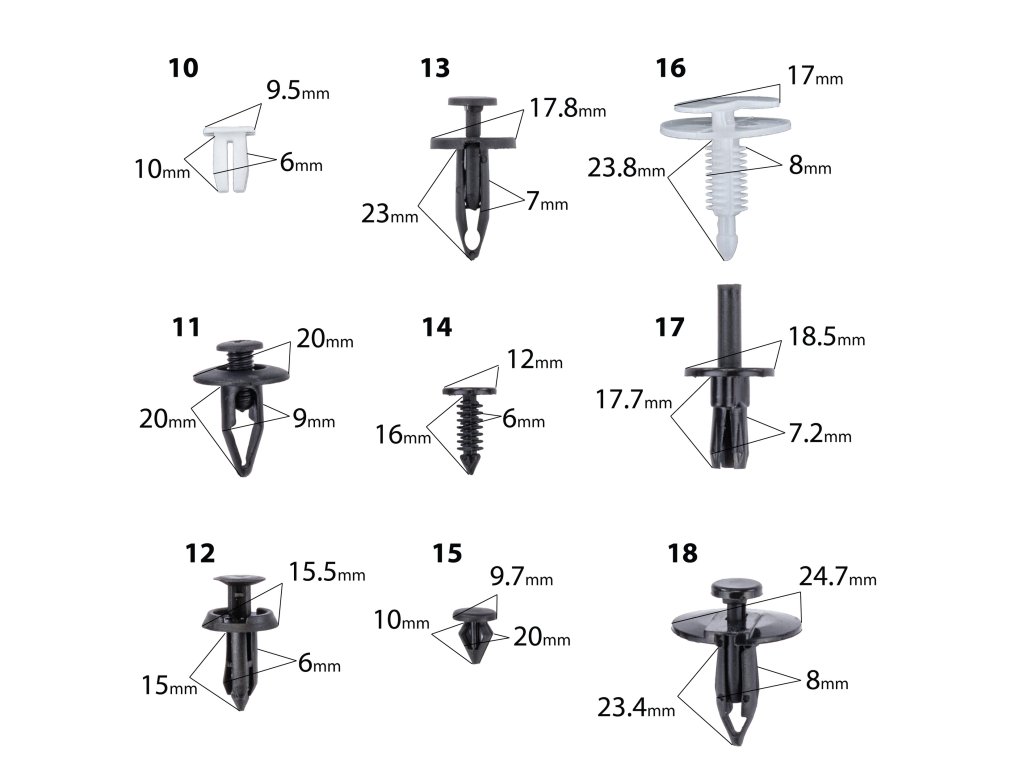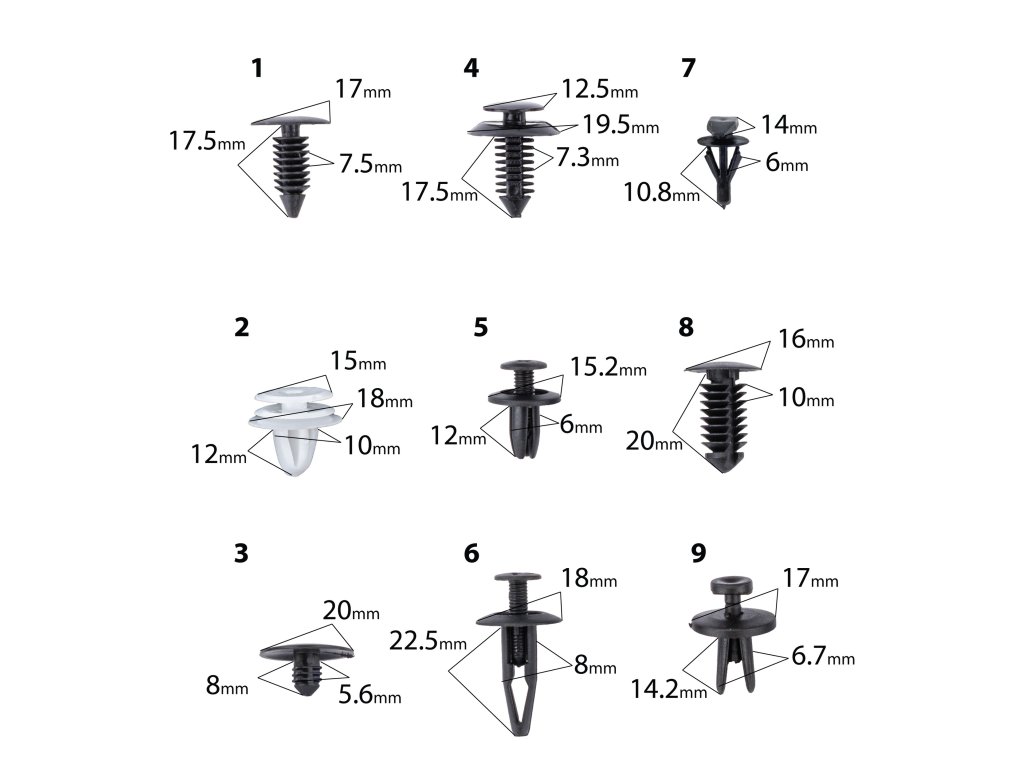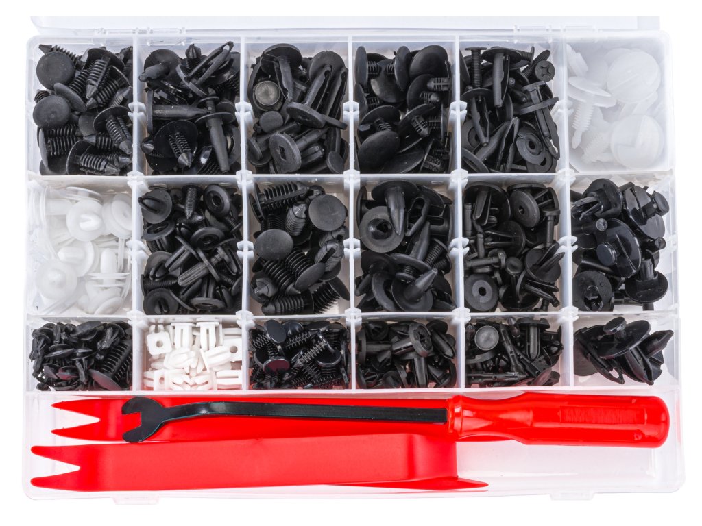 С този многофункционален комплект ще забравите за досадните проблеми с закрепването на тапицерията, броните, калниците и други пластмасови детайли по автомобила си!