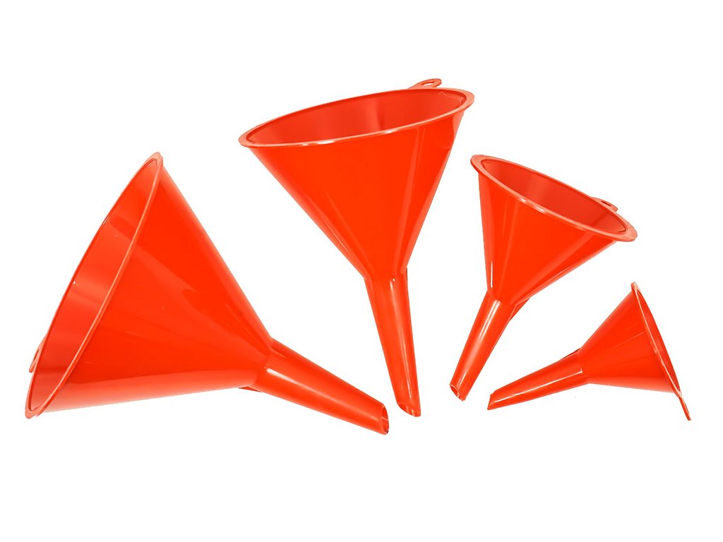 Комплект 4 универсални пластмасови фунии с различни диаметри (52, 75, 95, 115 мм). Подходящи за дома, гаража и работилницата.