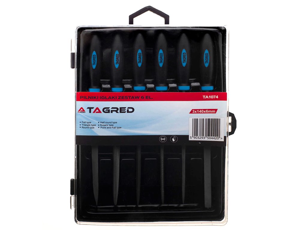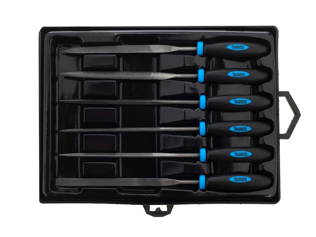 6 иглени пили с различна форма: кръгла, полукръгла, триъгълна, квадратна, плоска и плоска с наклон, всички съхранявани в удобен пластмасов калъф.