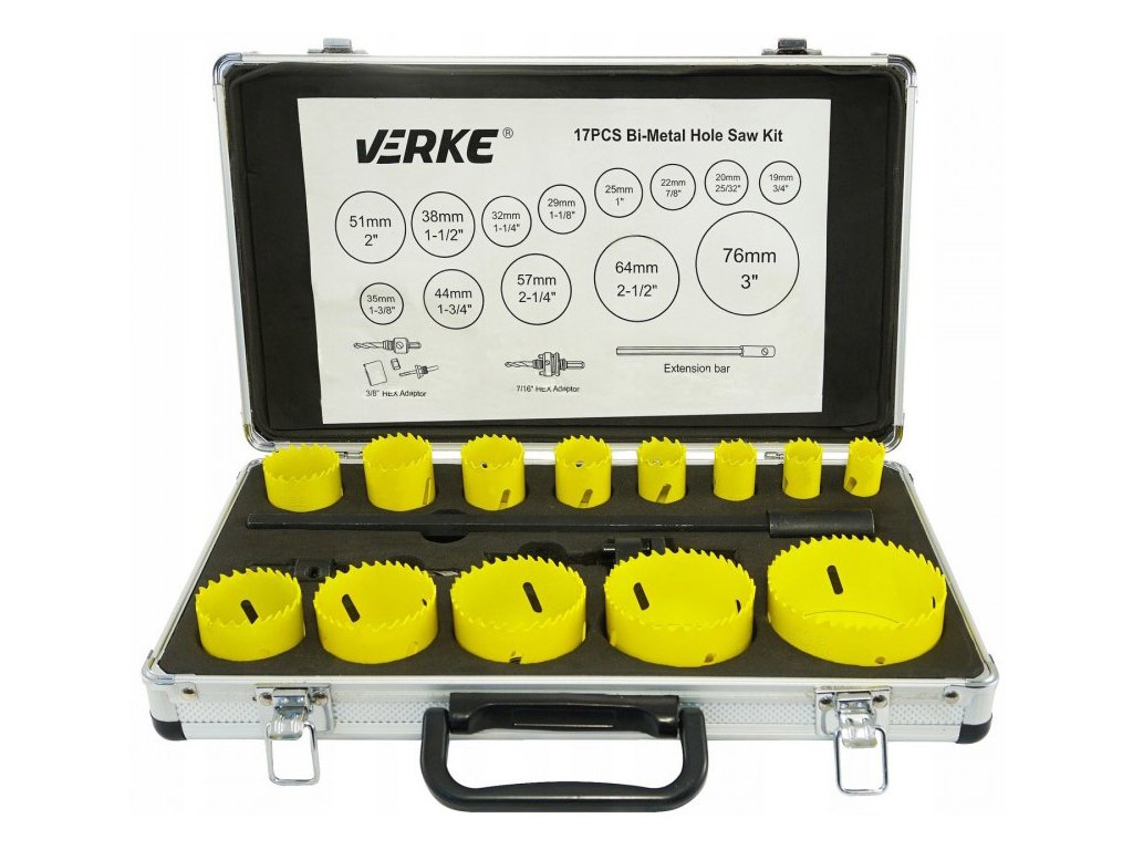 Комплект професионални биметални корони за метал VERKE за пробиване на големи отвори в метали, ламарина, профили и тръби. Подходящи също за работа с пластмаси, мебелни плоскости, конструктивни слоести панели и смоли. Препоръчва се за професионална употреба в индустрията, сервизи, работилници и домакинството.