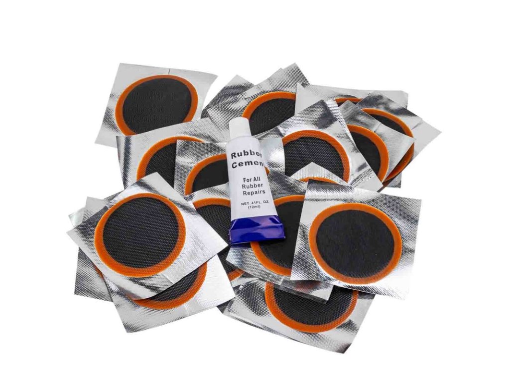 Практичен комплект за ремонт за велосипедисти, съдържа лепенки и лепило за бърз ремонт на спукана вътрешна гума.