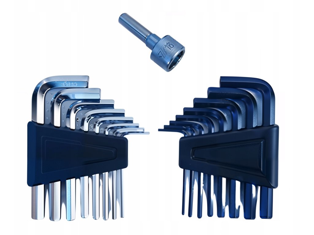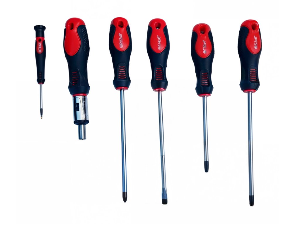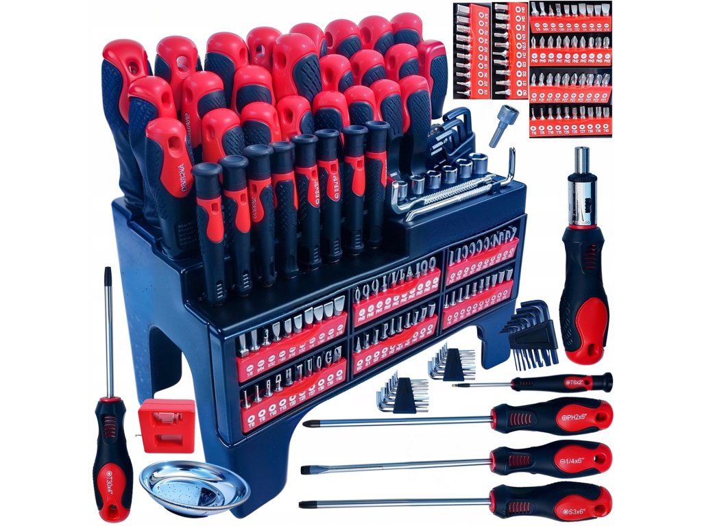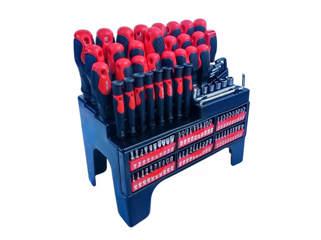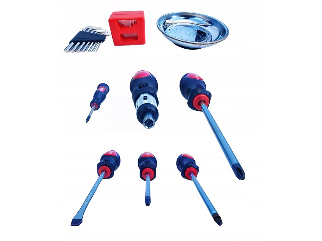 Комплектът е допълнен с практична стойка за лесна организация на инструментите и магнитна купа, която предотвратява загубата на дребни метални части. Ергономичните дръжки с антислип покритие осигуряват удобен и сигурен захват по време на работа.