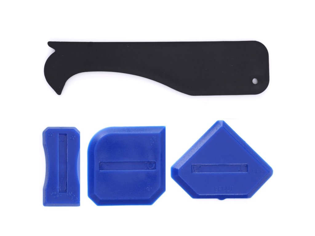 Висококачествен комплект силиконови шпакли, включващ 3 различно оформени инструмента и една пластмасова шпакла, изработени от термопластична гума (TPR). Тази специална материална структура предотвратява залепването на прясна силиконова и фугираща маса, което гарантира прецизно нанасяне и съвършено заглаждане.