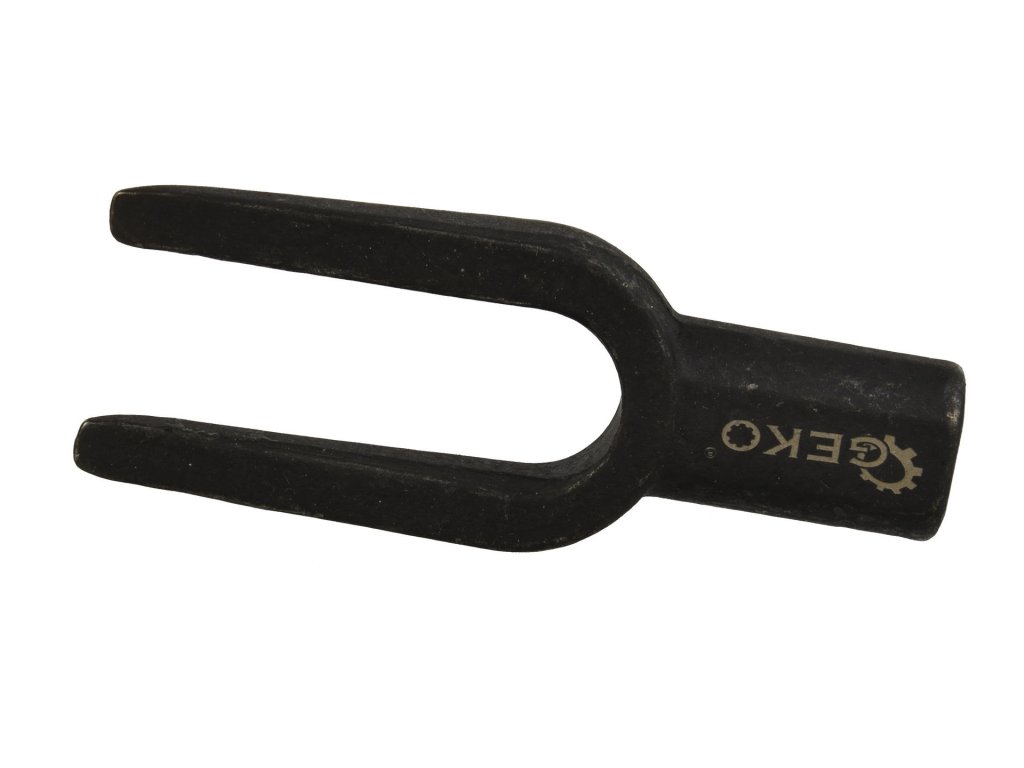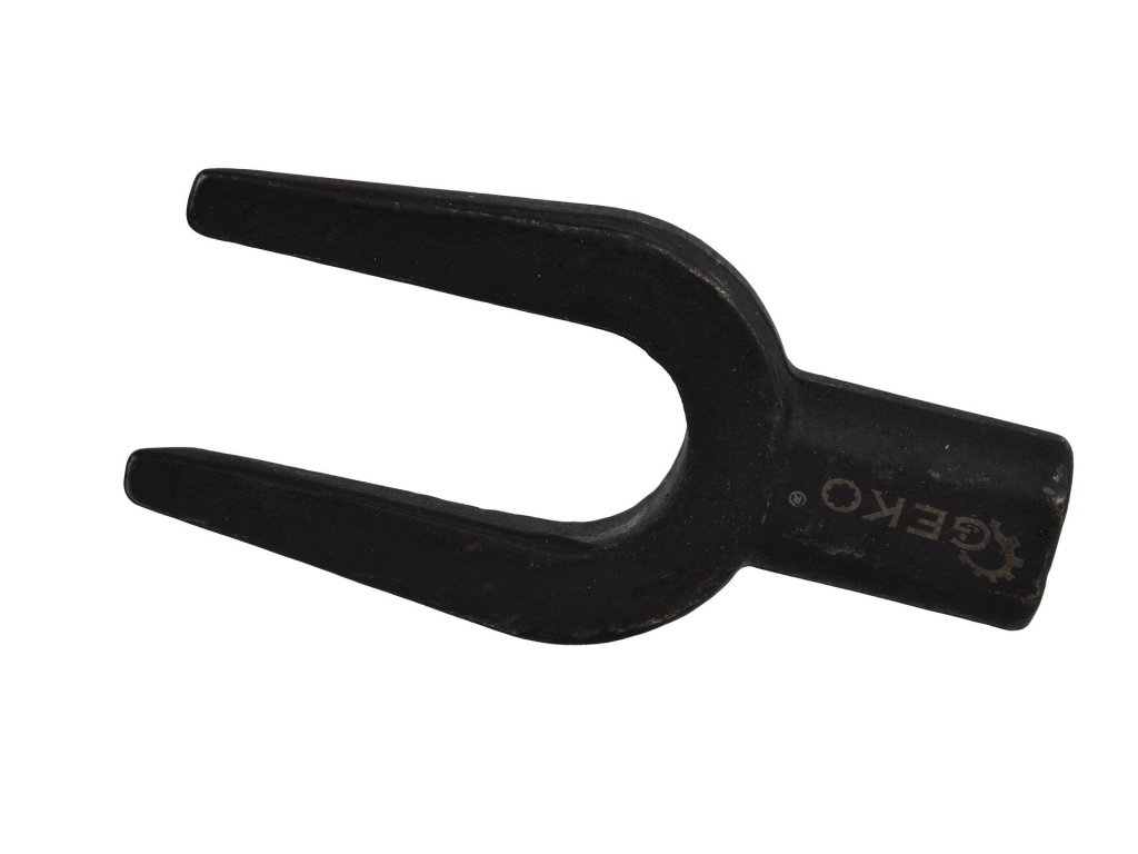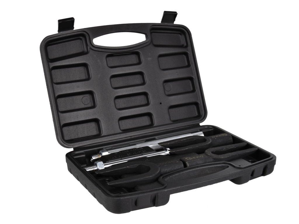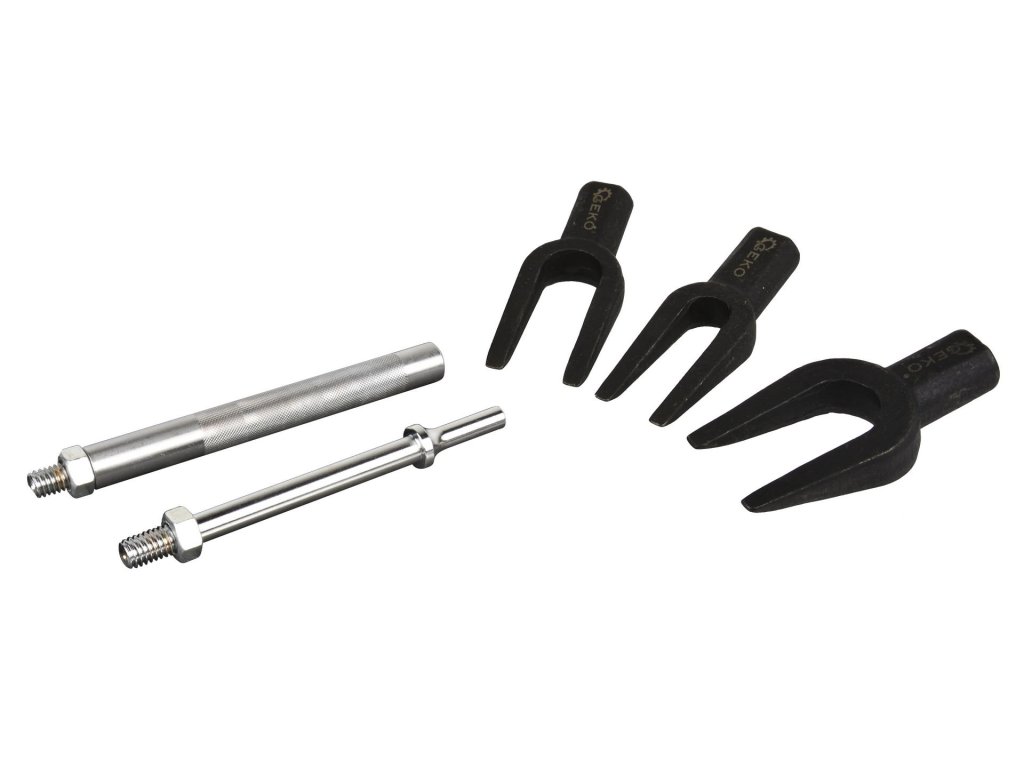 Този комплект вилковидни скоби за управление и сфери е изработен от хром-ванадиева стомана (CrV). Включва три вилковидни скоби с вътрешни ширини 28 мм, 24 мм и 17 мм, както и две дръжки, пригодени за работа с пневматично или ръчно чукче. Рамената на вилковите скоби имат здрави и прави клиновидни повърхности, които осигуряват лесно и прецизно захващане на сферичните болтове и управлението.