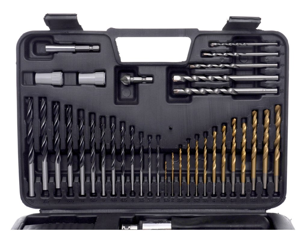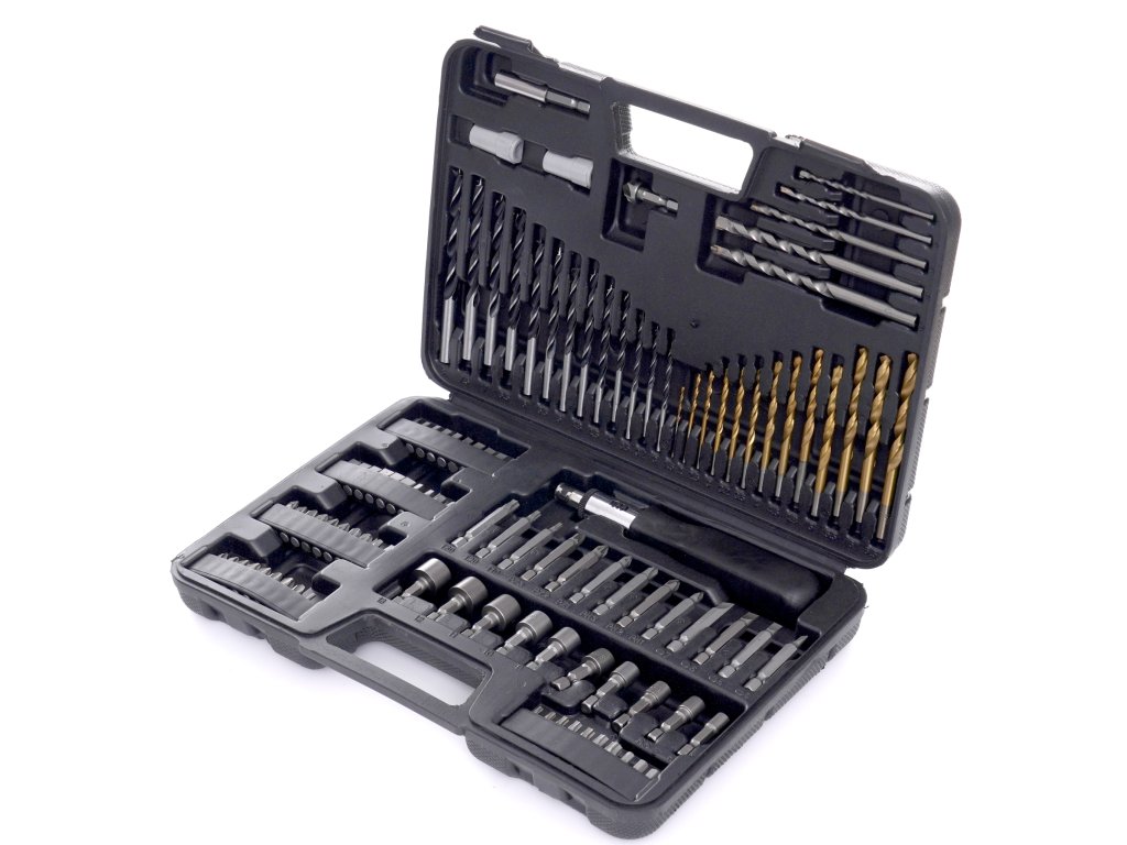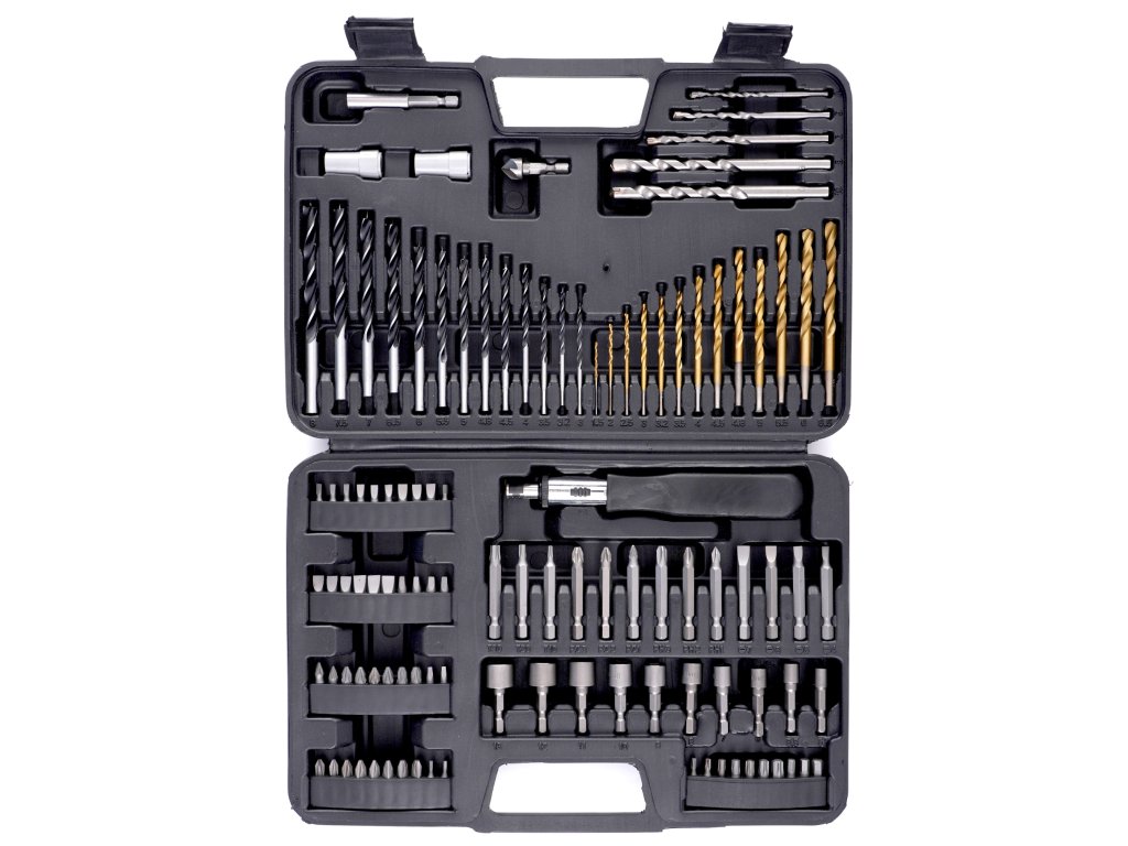 Комплект свредла и битове с отвертка, 109 части в куфар съдържа свредла, битове, полу кръгли накрайници и други необходими аксесоари за всеки дом. Изработен е от висококачествена стомана, като всички свредла са направени от бързорезна стомана DIN 338, обогатена с кобалт за повишена устойчивост и производителност. Тези свредла са проектирани за пробиване в различни материали като чугун, желязо, стомана, дърво и пластмаси.
