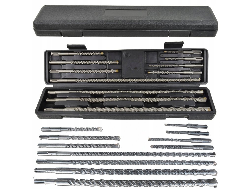 Професионален комплект свредла за бетон SDS Plus – 11 броя, включващ 11 висококачествени свредла с различни размери. Благодарение на новия дизайн с четирилентово S4 винтово направа и накрайник от карбид, този комплект позволява по-бързо и ефективно пробиване, дори в армиран бетон. Всички свредла са организирани в практичен куфар, който улеснява подреждането и преноса.
