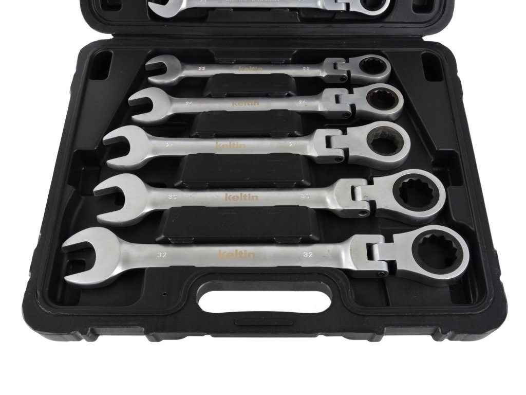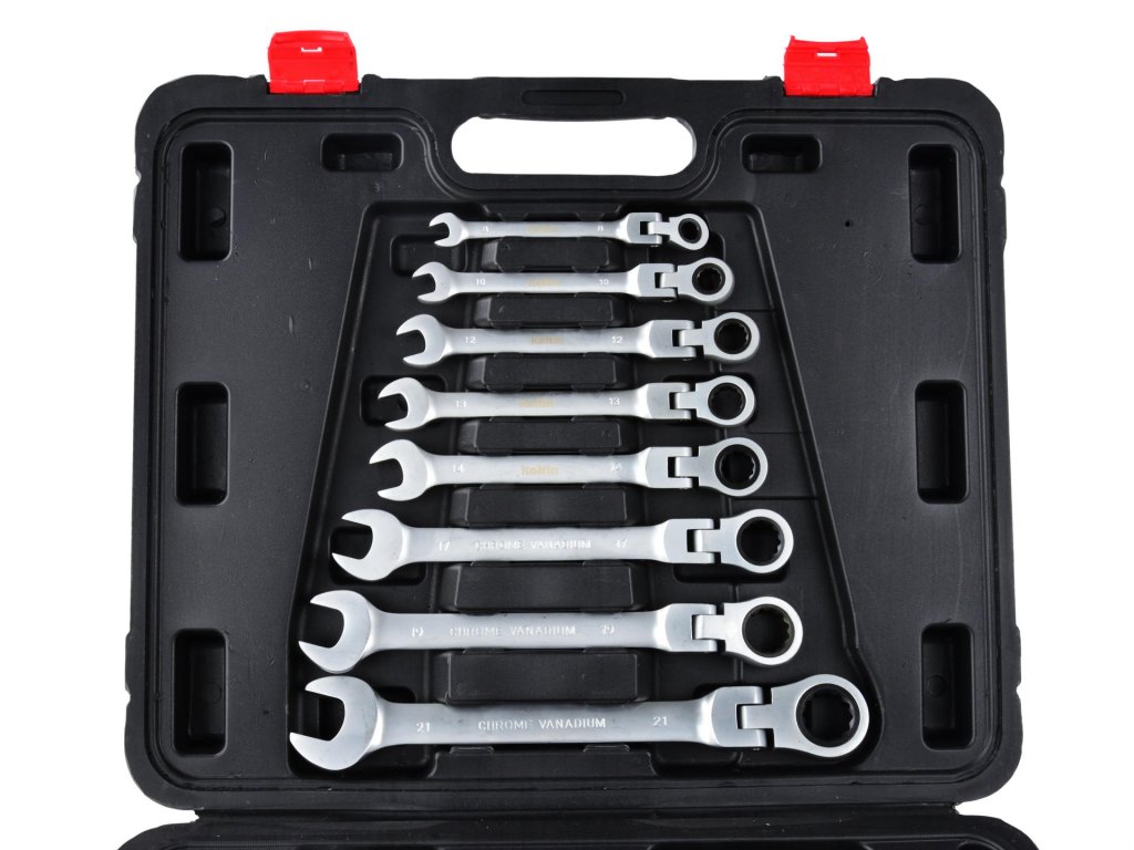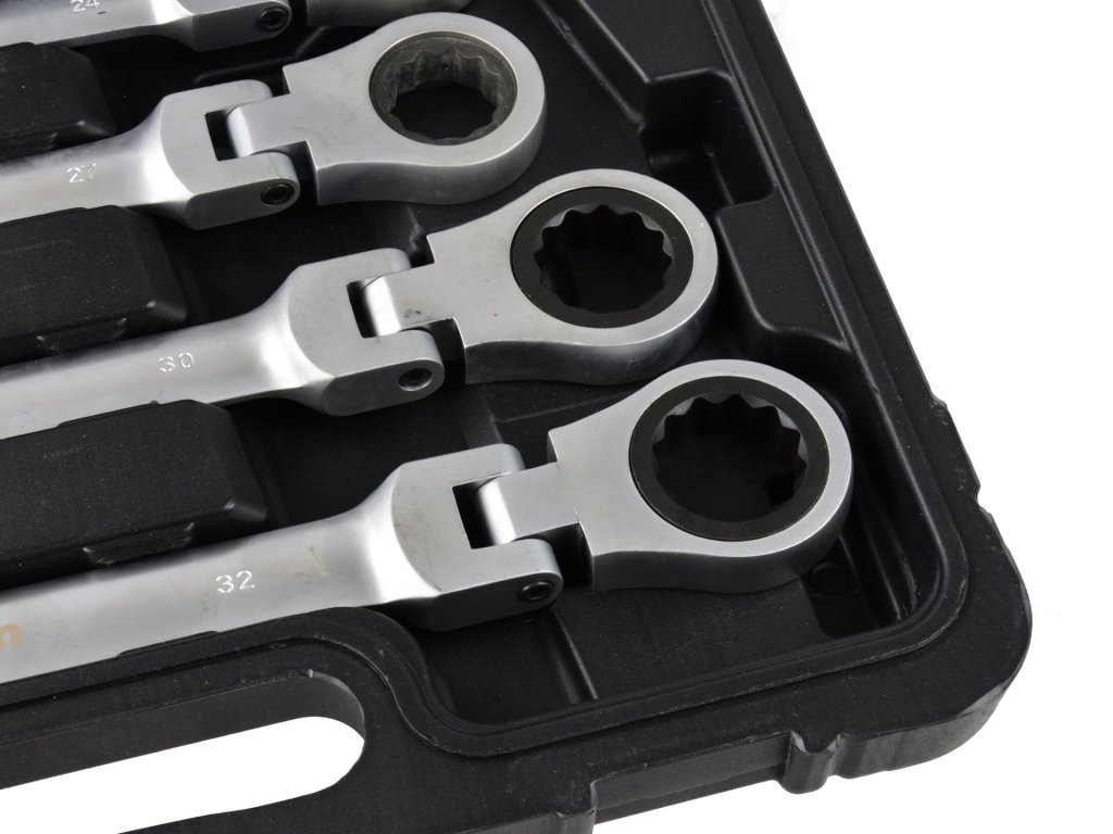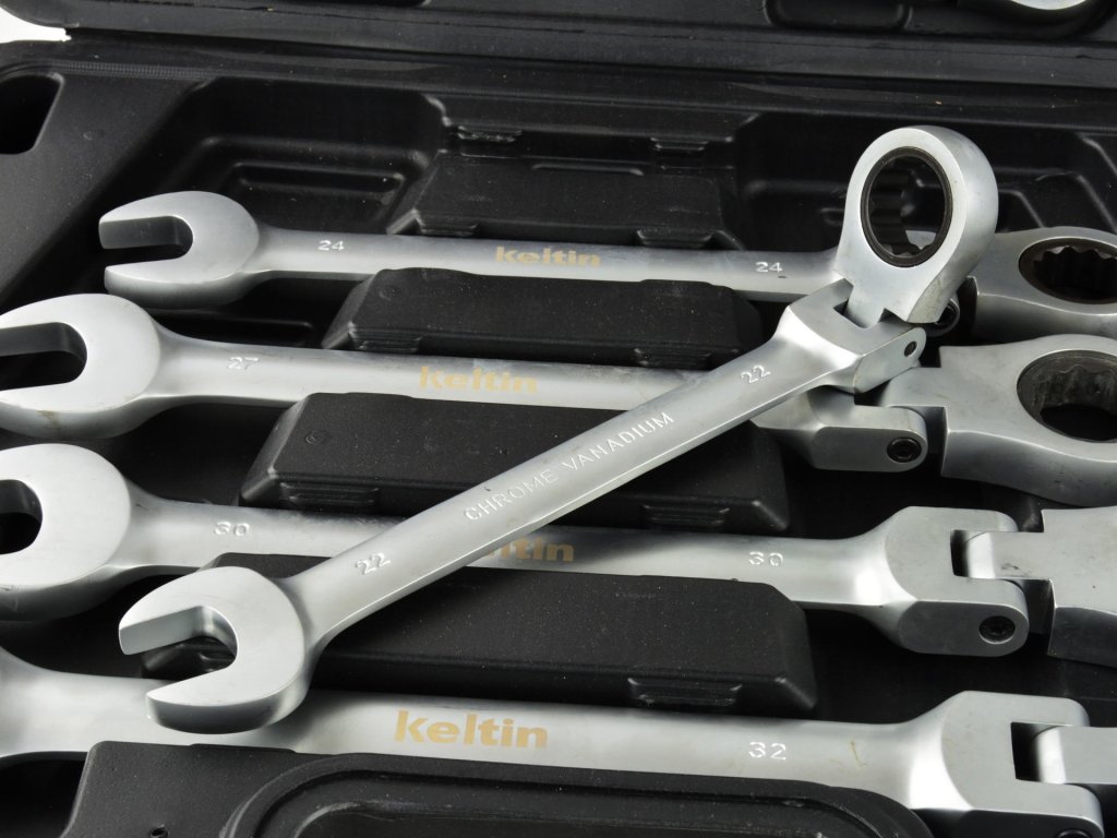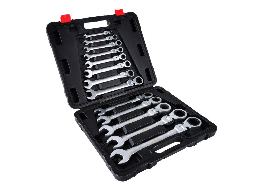 Комплект тресчотки с шарнирни ключове (72 зъба) с размери 8-32 мм е изработен от здрав хром-ванадиева стомана (CrV). Този комплект е перфектен не само за професионални автомеханични сервизи, но и за домашни гаражи. Ключовете са удобно подредени в пластмасов куфар.