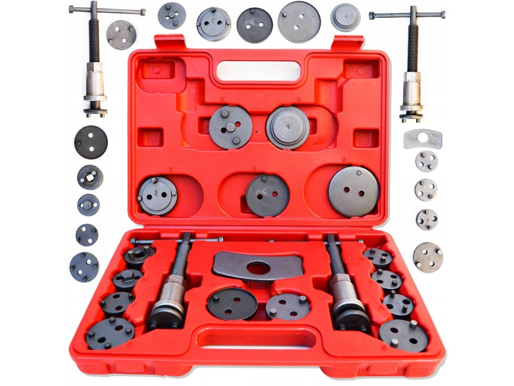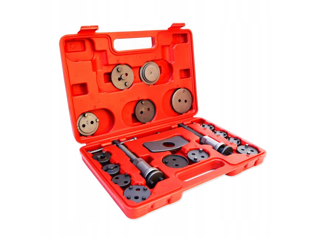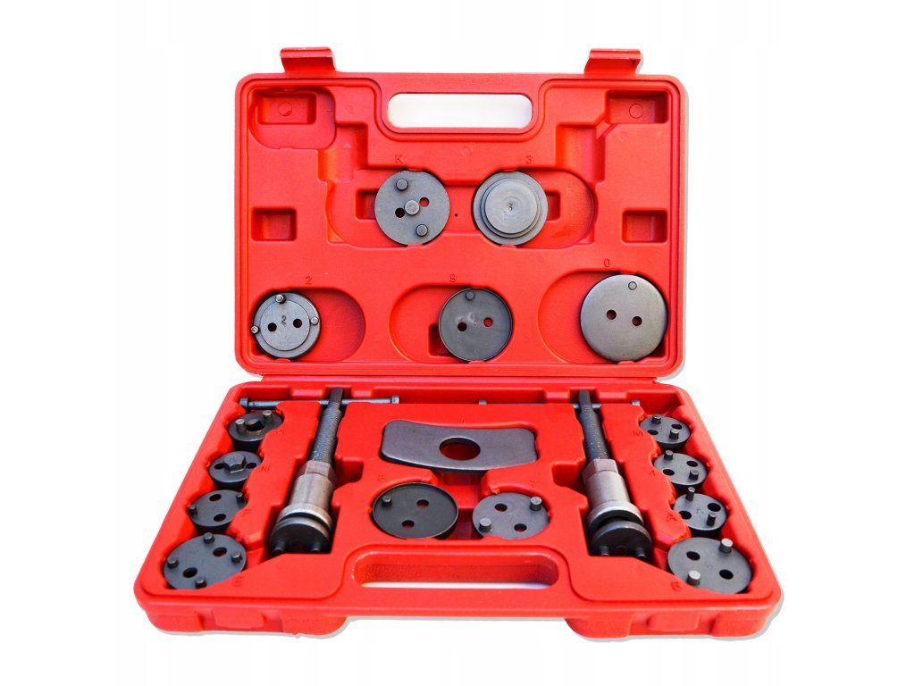 Този Комплект за натискане на спирачни бутала 18 части включва 18 инструмента, съхранявани в здрав пластмасов куфар за лесно пренасяне и защита на инструментите. Комплектът е изработен от висококачествена стомана и съдържа два натискащи инструмента (десен и ляв механизъм), две различни опорни плочи за използване с спирачни апарати, както и няколко адаптера, пригодени за различни размери на спирачни бутала, които са съвместими с повечето леки автомобили на европейския и азиатския пазар.