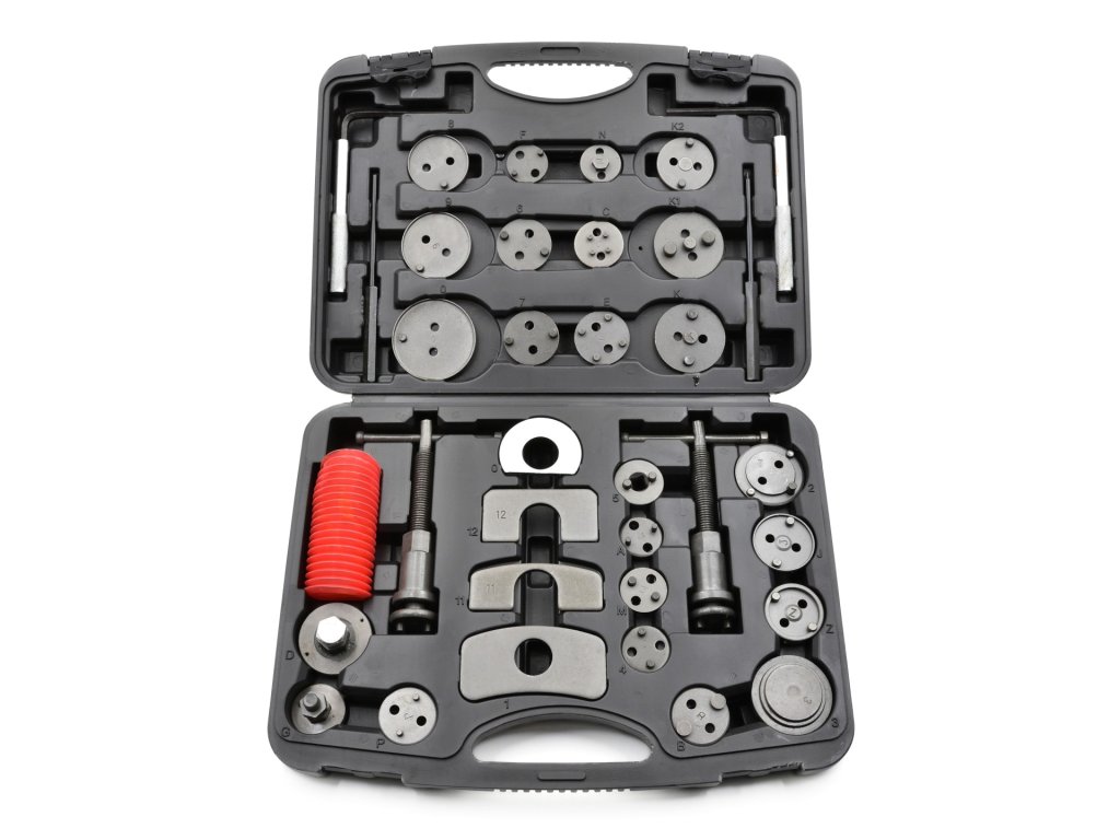 Професионален комплект за натискане на спирачни бутала 35 части G02542 е незаменим при ремонти на автомобили, оборудвани с дискови спирачки. Този комплект е съвместим с повечето автомобили на пазара, включително марки като Audi, Fiat, Ford, Isuzu, Honda, Jaguar, BMW, Mercedes Benz, Mitsubishi, Nissan, Toyota, Renault, Volvo, Citroen, Opel, SAAB, GM и VW.