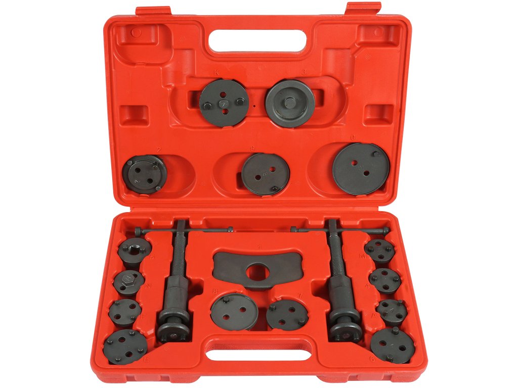 Професионален 18-частен комплект за притискане/връщане на спирачни бутала, незаменим при ремонти на автомобили с дискови спирачки. Инструментът се състои от два винтови преса – с десен и ляв винт – и комплект от шайбички, които позволяват смяна на бутала в широка гама автомобили. Дръжката е с магнитен край, който осигурява стабилно задържане на шайбата, подходяща за конкретното бутало, в оста ѝ. Комплектът е предназначен за всеки автосервиз, като значително ускорява обслужването на спирачните системи.
