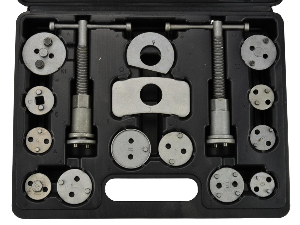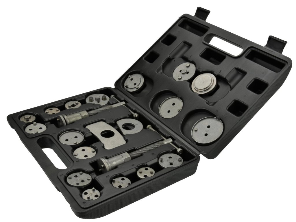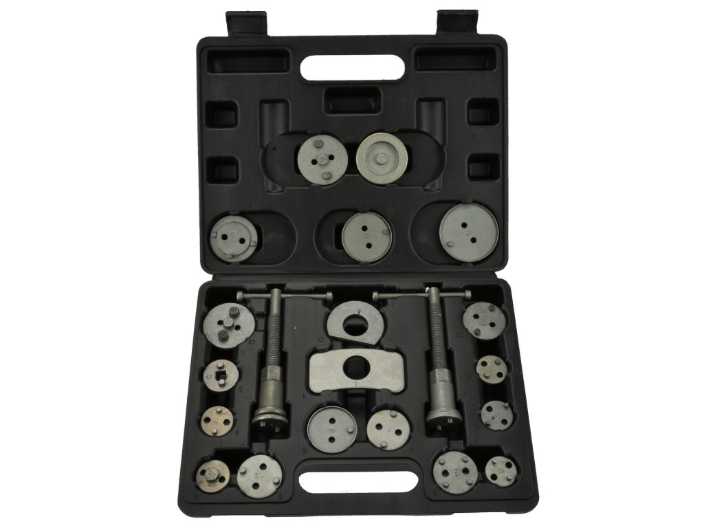 Професионален комплект за притискане на спирачни бутала 21 части G02541 е незаменим инструмент за ремонт на автомобили, оборудвани с дискови спирачки.