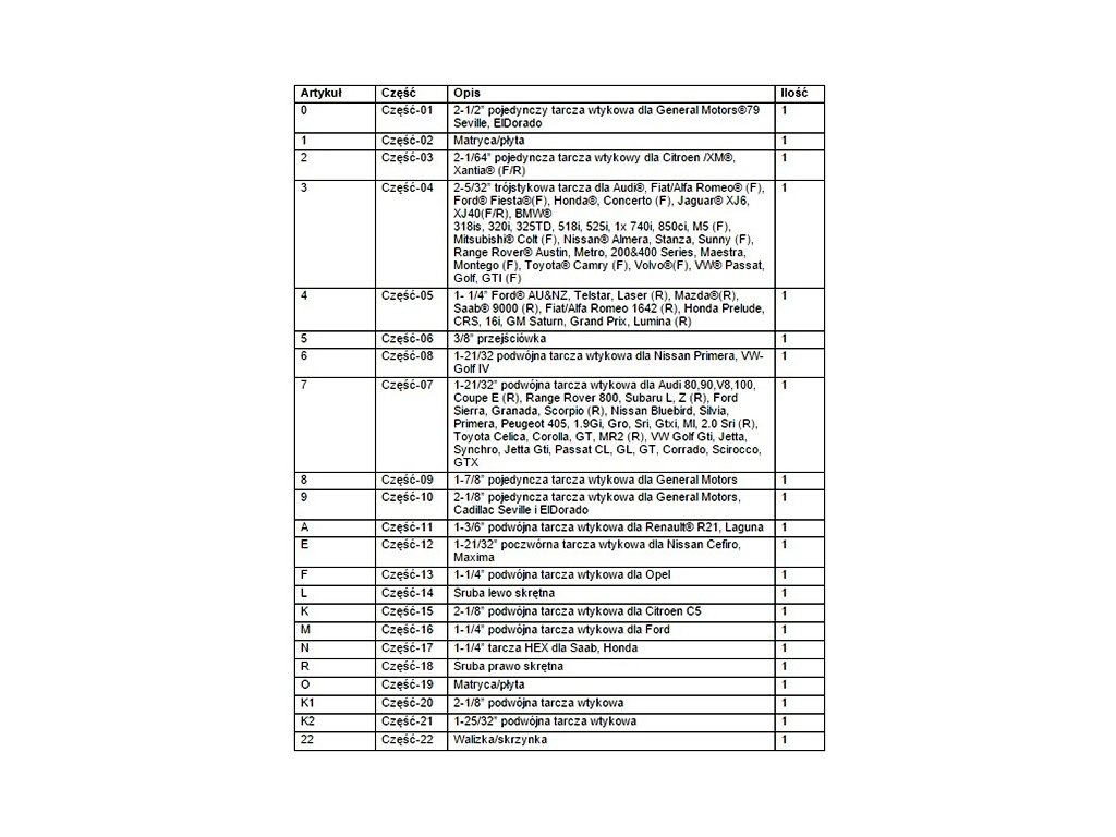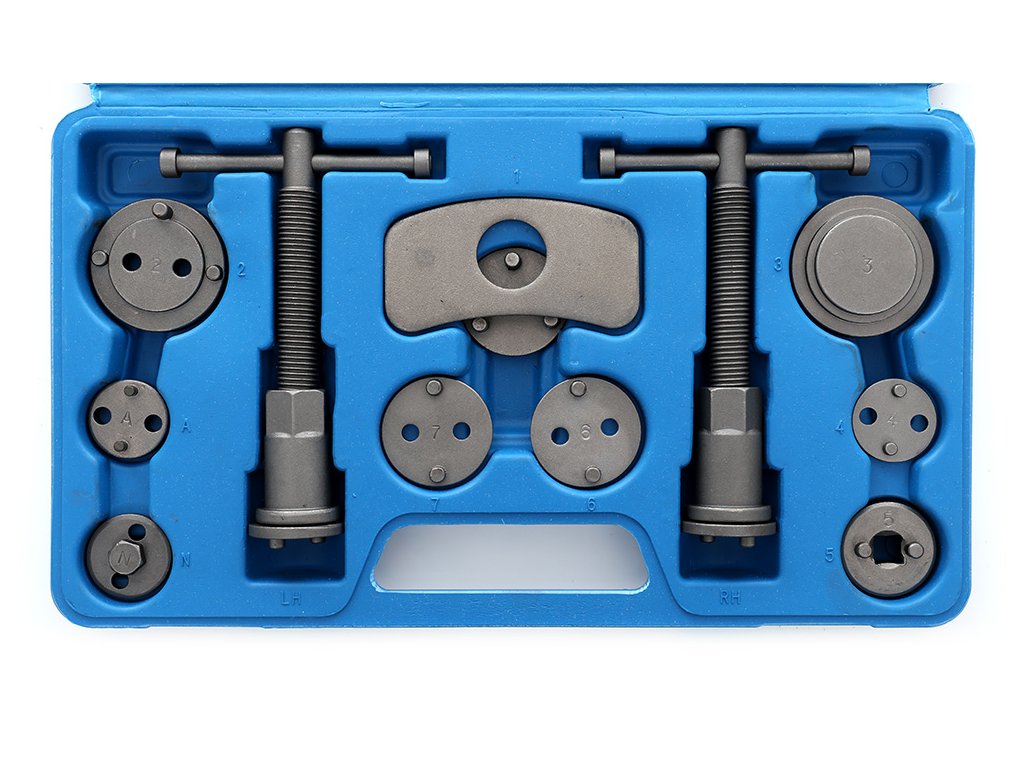 - Оборудването включва два вида преса (дясно- и лявоусукваща), два различни накрайника за подпиране на пресата върху седлото на спирачния апарат и обширен набор от адаптери. Точното позициониране на адаптера и буталото осигурява правилното вкарване на буталото в цилиндъра на спирачния апарат, което предпазва механика от заклинване и блокиране на буталото в цилиндъра. Въртящият се бутон с магнитен връх държи плочката центрирана спрямо буталото, което гарантира лесна работа. Този комплект се препоръчва за общо-механични автосервизи и е особено ефективен при работа с керамични бутала.