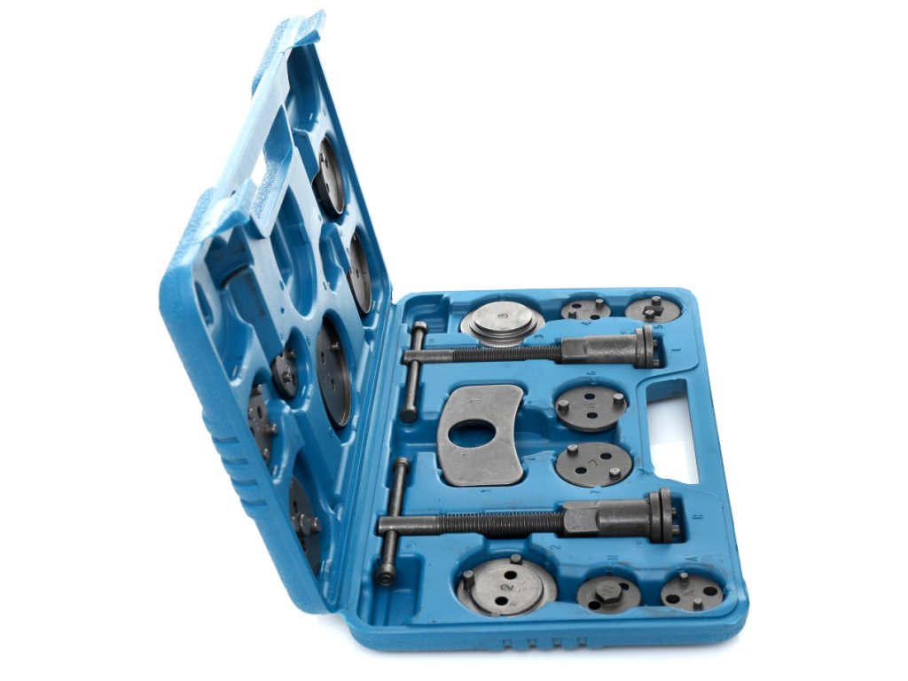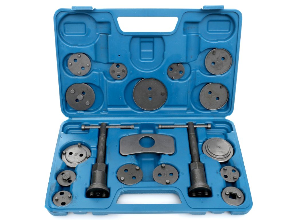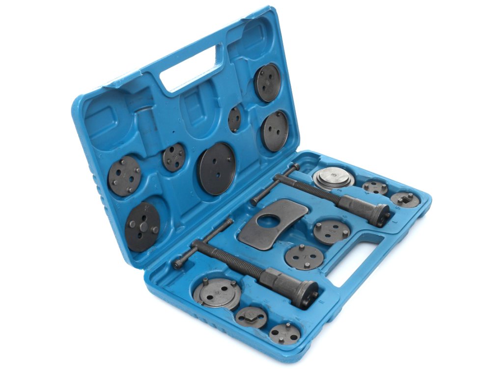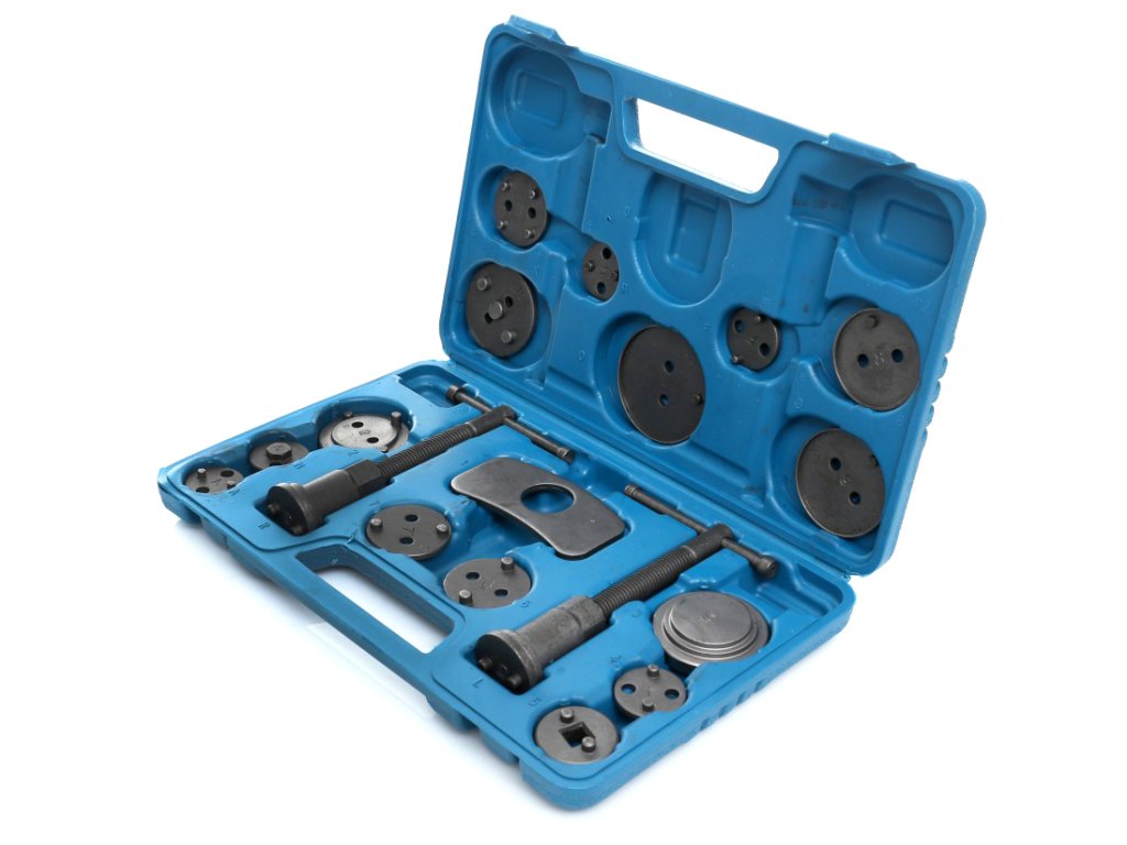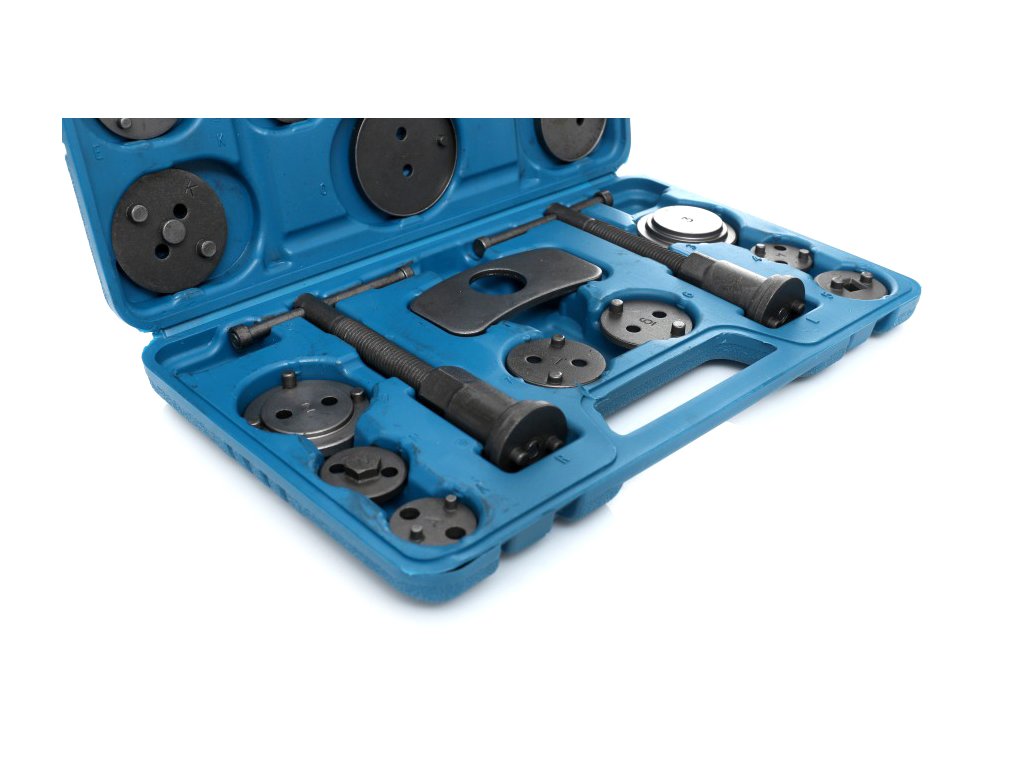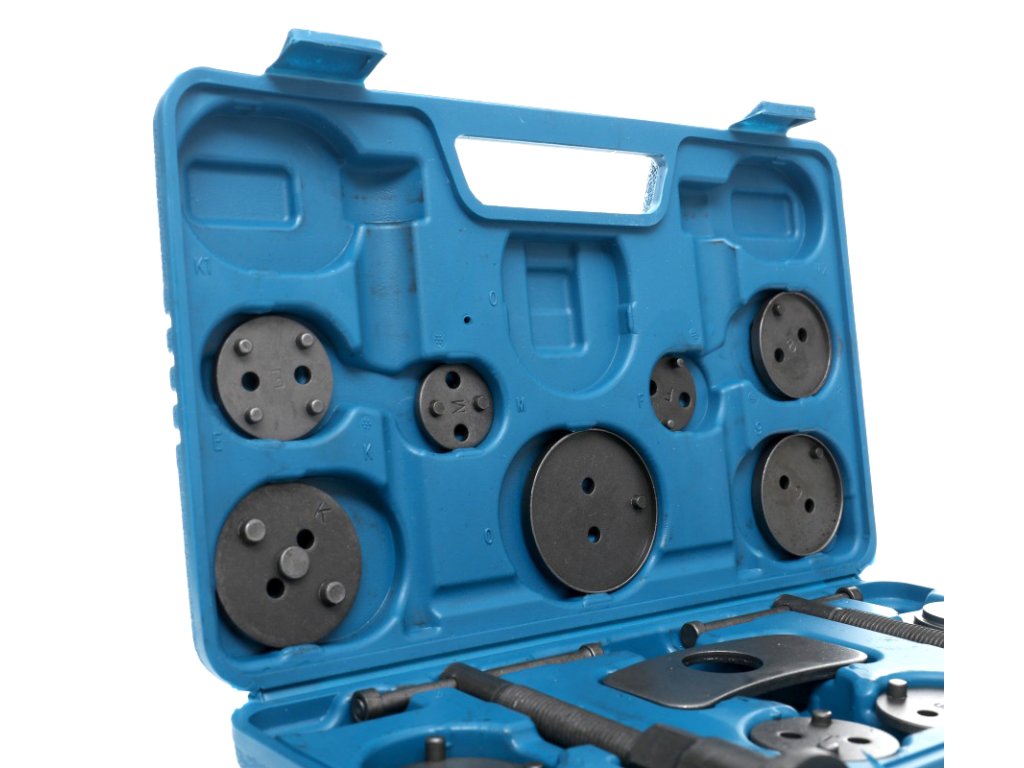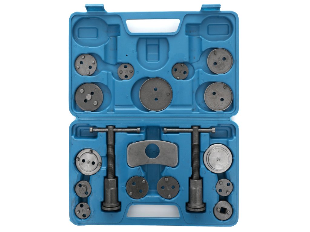 Комплект за ремонт и натискане на спирачни бутала 18 части + куфар е професионален, голям и практичен комплект, който съдържа общо 18 части. Този комплект е незаменим за натискане на спирачните бутала в железни спирачни цилиндри и е идеален за ремонт на превозни средства с дискови спирачки.