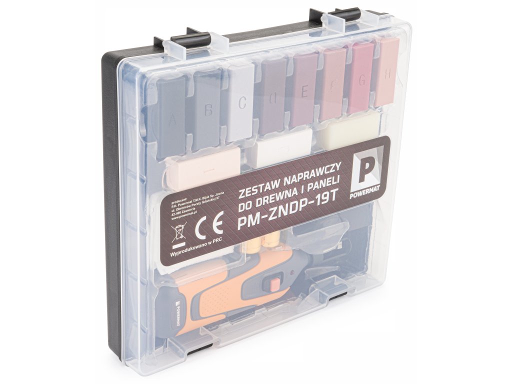 Компактен комплект POWERMAT за ремонт на прозорци, врати и дървени подове, който осигурява бързо и трайно заличаване на повърхностни и по-дълбоки драскотини, дупки, възстановяване на повредени ъгли и ръбове както на декоративни, така и на дървени повърхности. Отличен избор за локални ремонти. Комплектът съдържа всички необходими инструменти за извършване на поправки.
