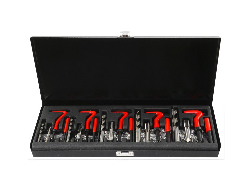 Висококачествен комплект за ремонт на резби, който позволява замяна на повредени резби с нова резбова вложка. Свредлата и метчиците са изработени от бързорежеща HSS стомана. Еднофазните метчици оформят резбата, в която се вкарва спиралната вложка от висококачествена неръждаема стомана. За поставяне на вложката служи водещия въртящ се държач и удряч, който отчупва изпъкналия край на вложката. Комплектът е предназначен за 5 типа резби: