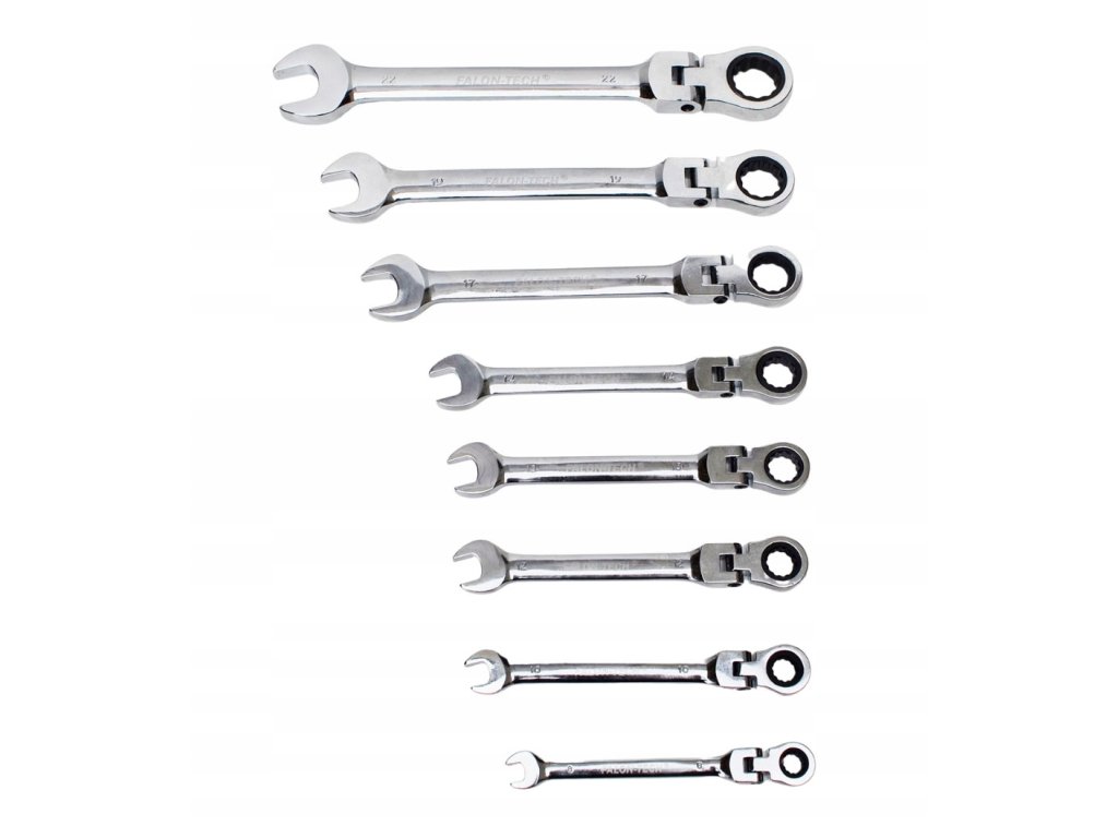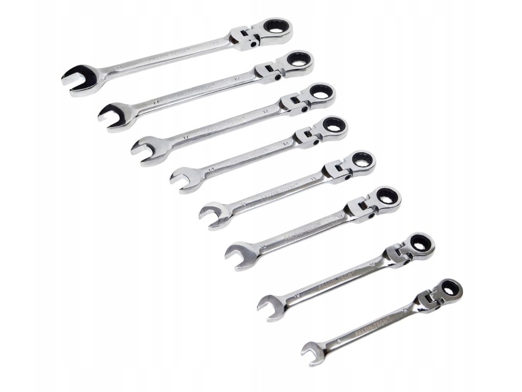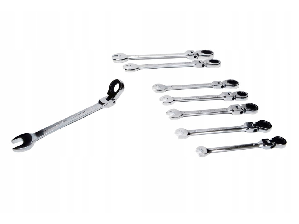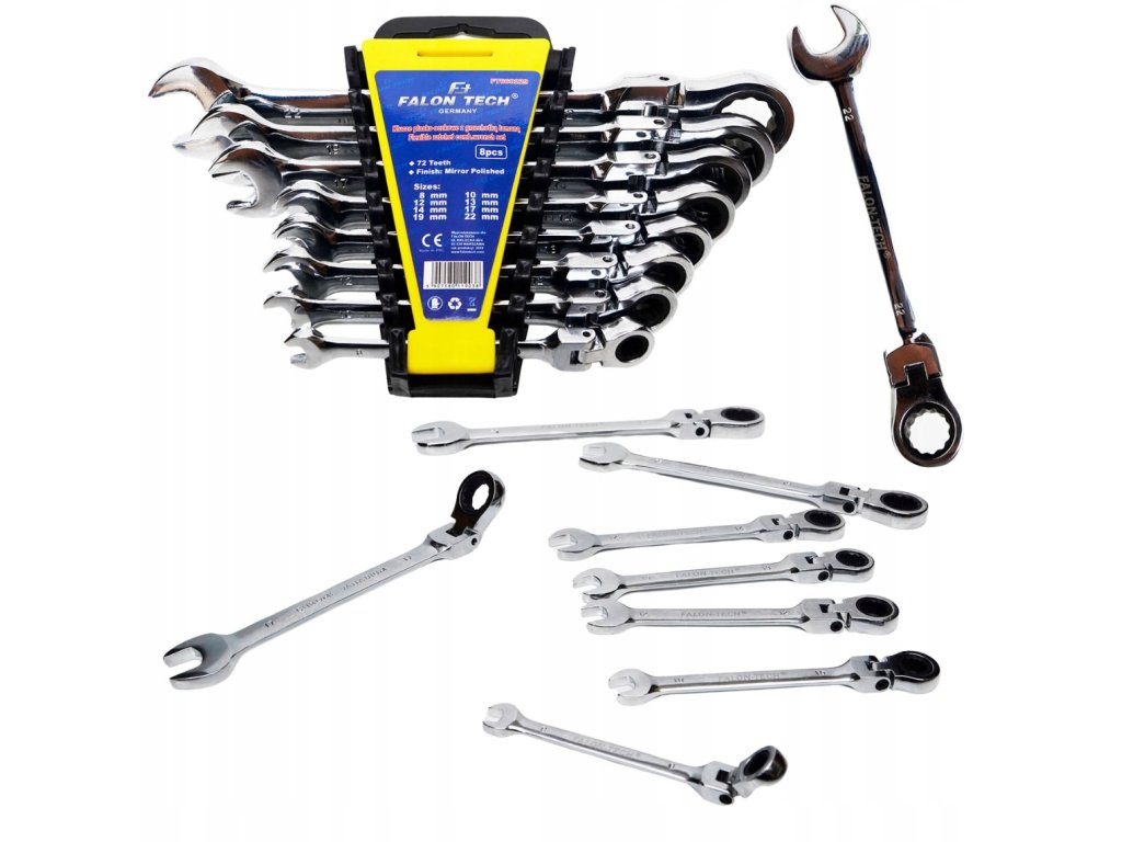 Комплект звездогаечни ключове с тресчотка в размерен диапазон от 8 до 22 мм е идеален както за професионална, така и за домашна употреба. Благодарение на подвижната глава и тресчотковия механизъм осигурява бърза и ефективна работа с минимално завъртане на ключа от само 5°. Изработени от издръжлива хром-ванадиева стомана, тези ключове са подходящи за труднодостъпни места и справяне с по-тежки задачи.