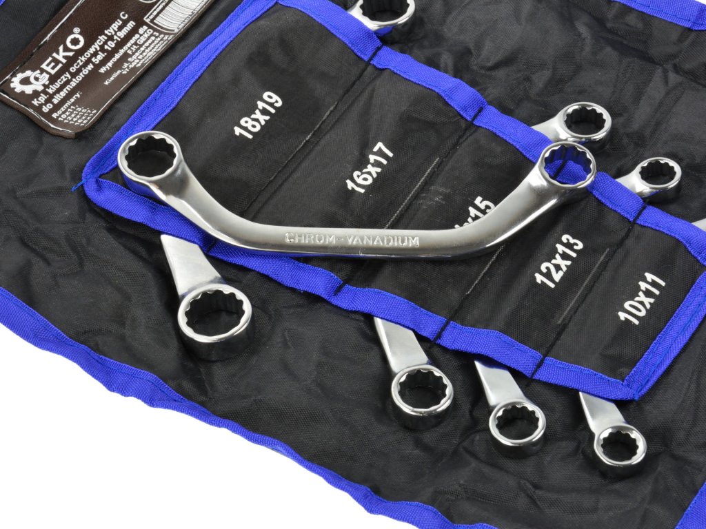 Комплект звездогаечни ключове тип C за алтернатори 5 части 10-19 мм G11150 е идеален за работа на труднодостъпни места. Ключовете са изработени от висококачествен хром-ванадиев (CrV) стомана, която гарантира повишена устойчивост на механични повреди.