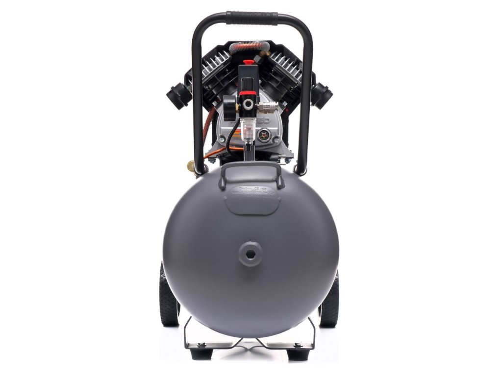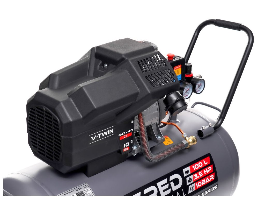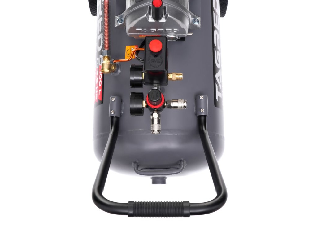 Компресорът е оборудван с редуцир вентил с манометър, кондензатоотделител и бързи връзки за лесно свързване на инструменти. Благодарение на големия резервоар с обем 100 литра, той позволява по-дълга работа без често превключване на двигателя.