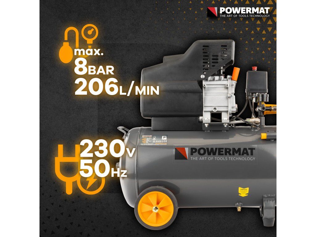 Компресорът PM-KO-50T от полската марка POWERMAT е проектиран за широк спектър от приложения, включително боядисване (малки елементи/повърхности), духане, напомпване и почистване. Сред предимствата му са ниски експлоатационни разходи, многофункционалност, прецизност и висок стандарт на работен комфорт.