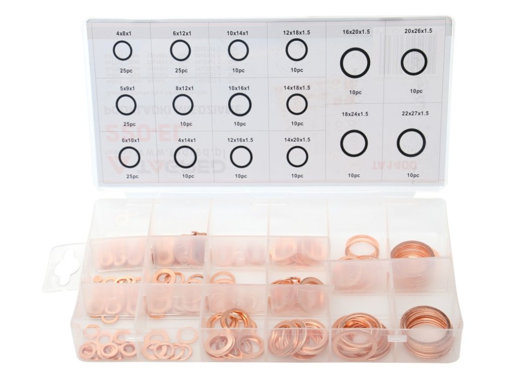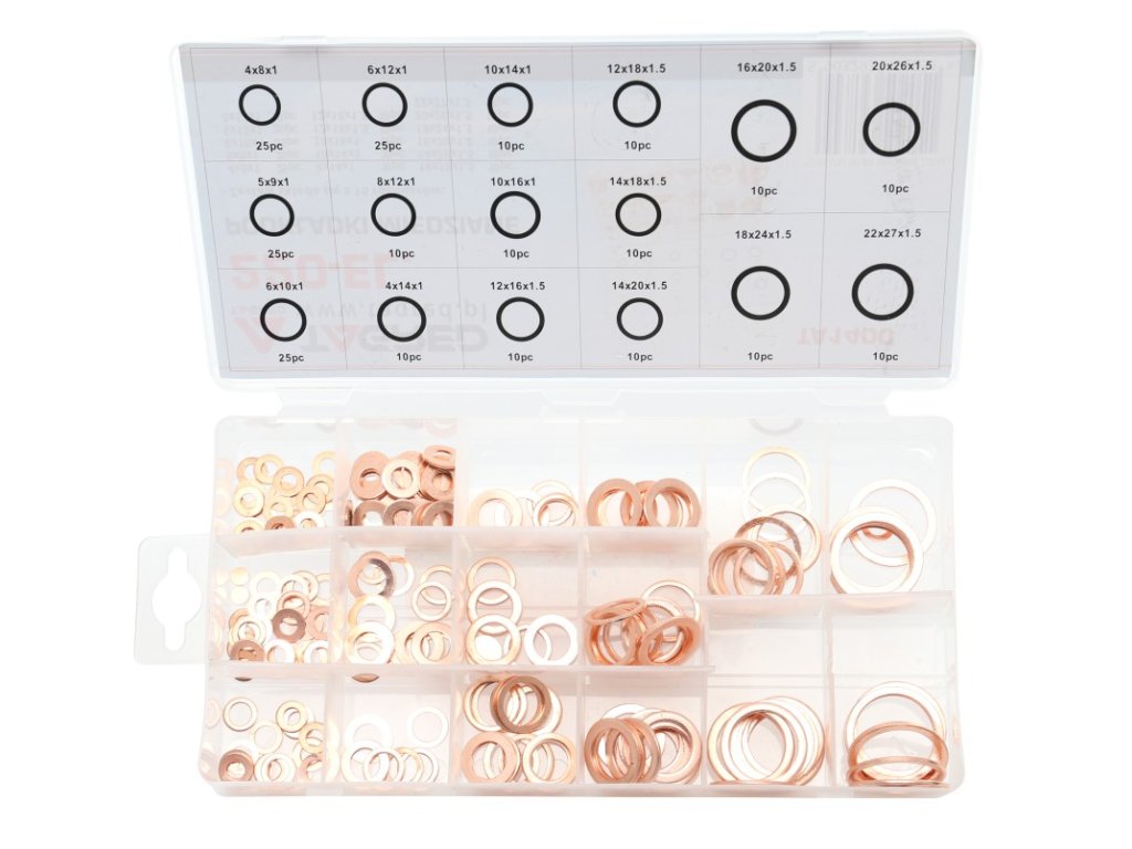 Комплектът включва 220 броя медни шайби, които са съхранени в удобен органайзер за лесен преглед и употреба.
