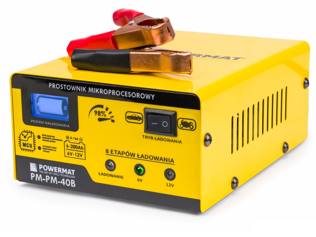 Зарядното устройство Микропроцесорно зарядно устройство за автомобилни акумулатори 6/12V PM-PM-40B на марката Powermat е първото на пазара с микропроцесорно управление и PWM технология, което интелигентно и прецизно настройва параметрите за зареждане на акумулатори 6V и 12V и може да възстанови изтощени и неглижирани акумулатори.