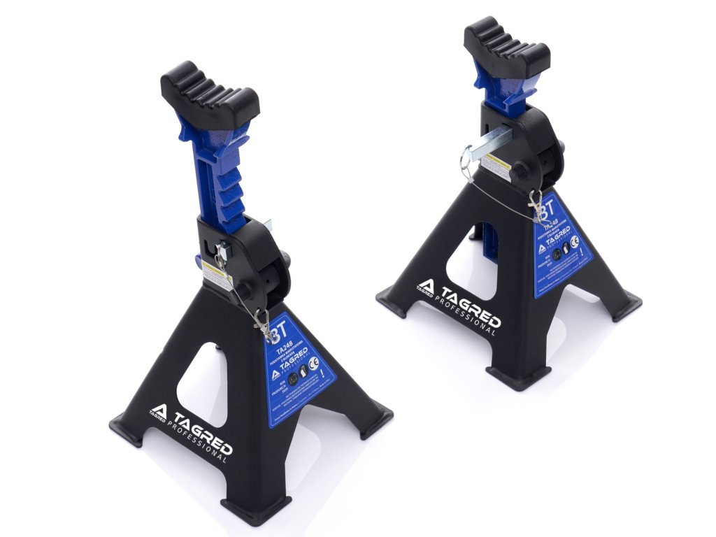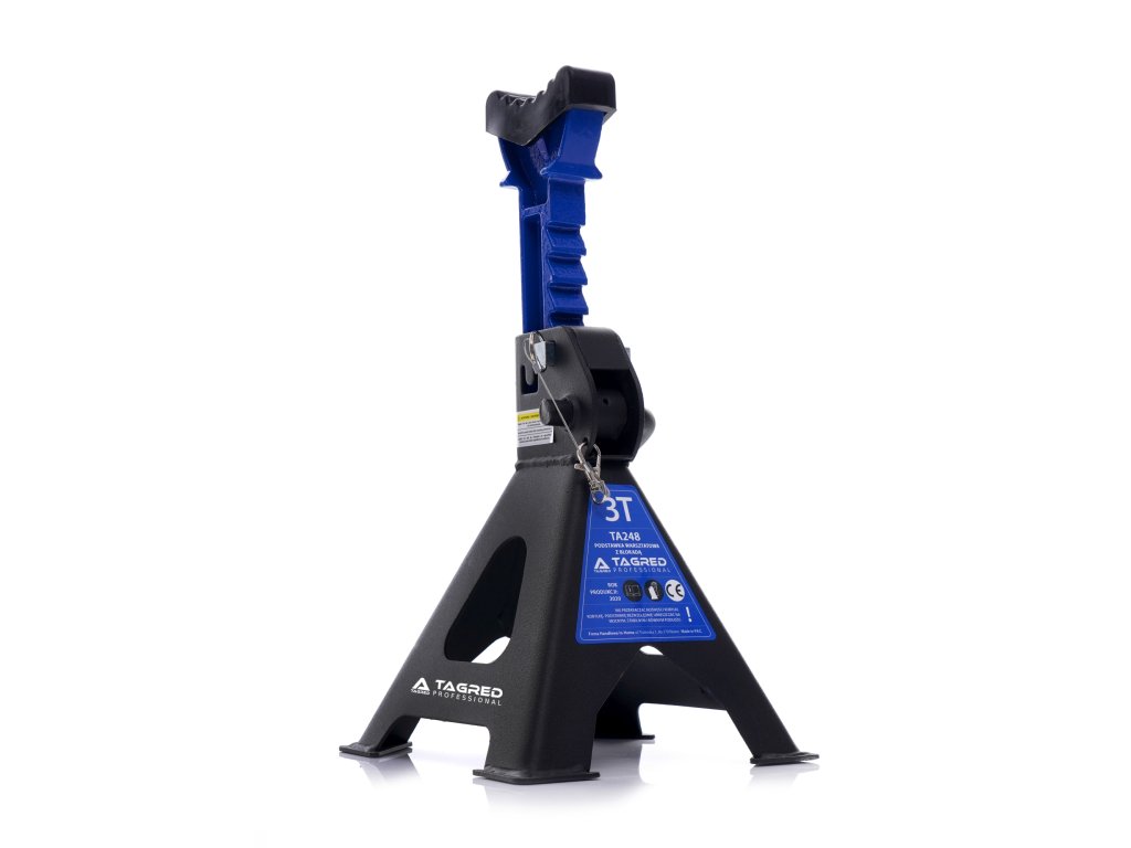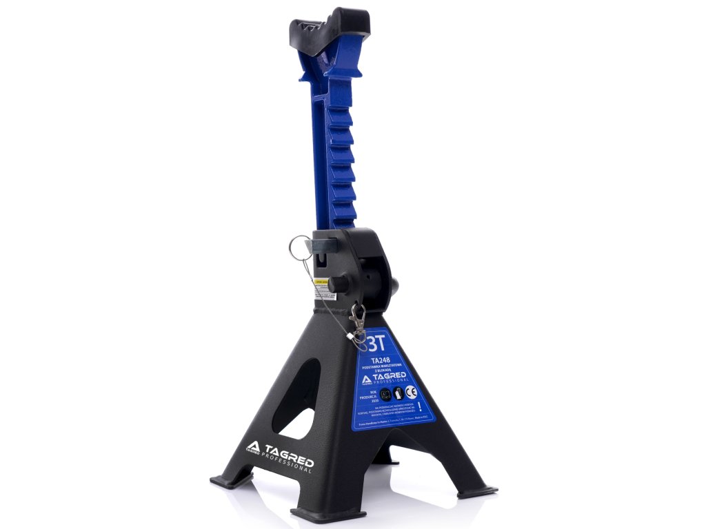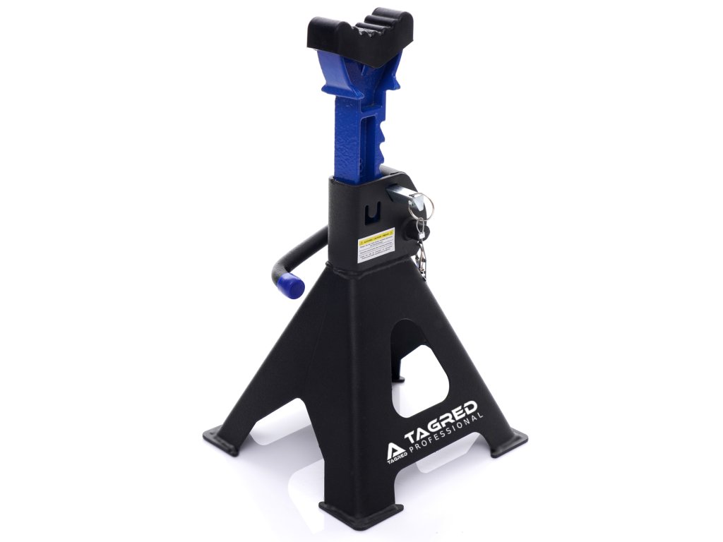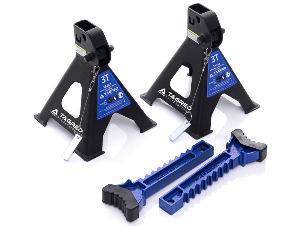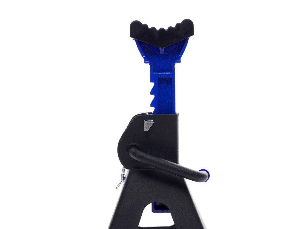 Носачи 3 тона, работни стойки за автомобил, подсилени, щифтове, ключалки, гумени, 2 бр. са проектирани да издържат предмети с тегло до 3 тона. Изработени са от висококачествени материали, включително здрава стоманена ламарина. Тези носачи са оборудвани с безопасностна ключалка, гумени подложки и механизъм с щифт, който позволява много прецизно регулиране на височината на различни нива.