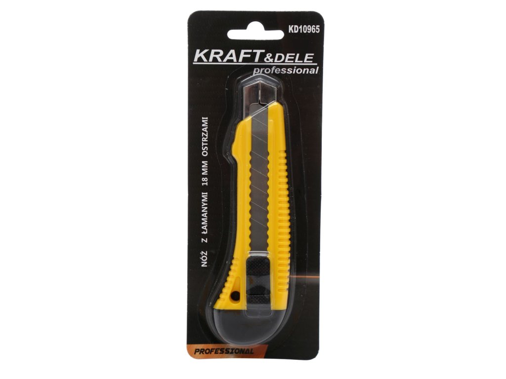 Нож със счупващо се острие 18 мм KD10965 на марката Kraft & Dele е универсално приложение и отлично се справя при рязане на: хартия, картон, текстил, килими, ленти, кабели и т.н.