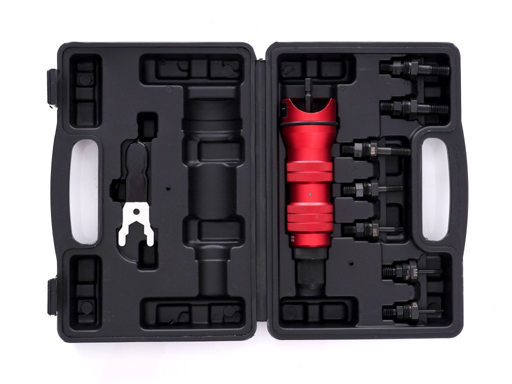 Цялото устройство е опаковано в практичен и компактен калъф за пренасяне. Подходяща за нитове: алуминий, мед, стомана, неръждаема стомана.