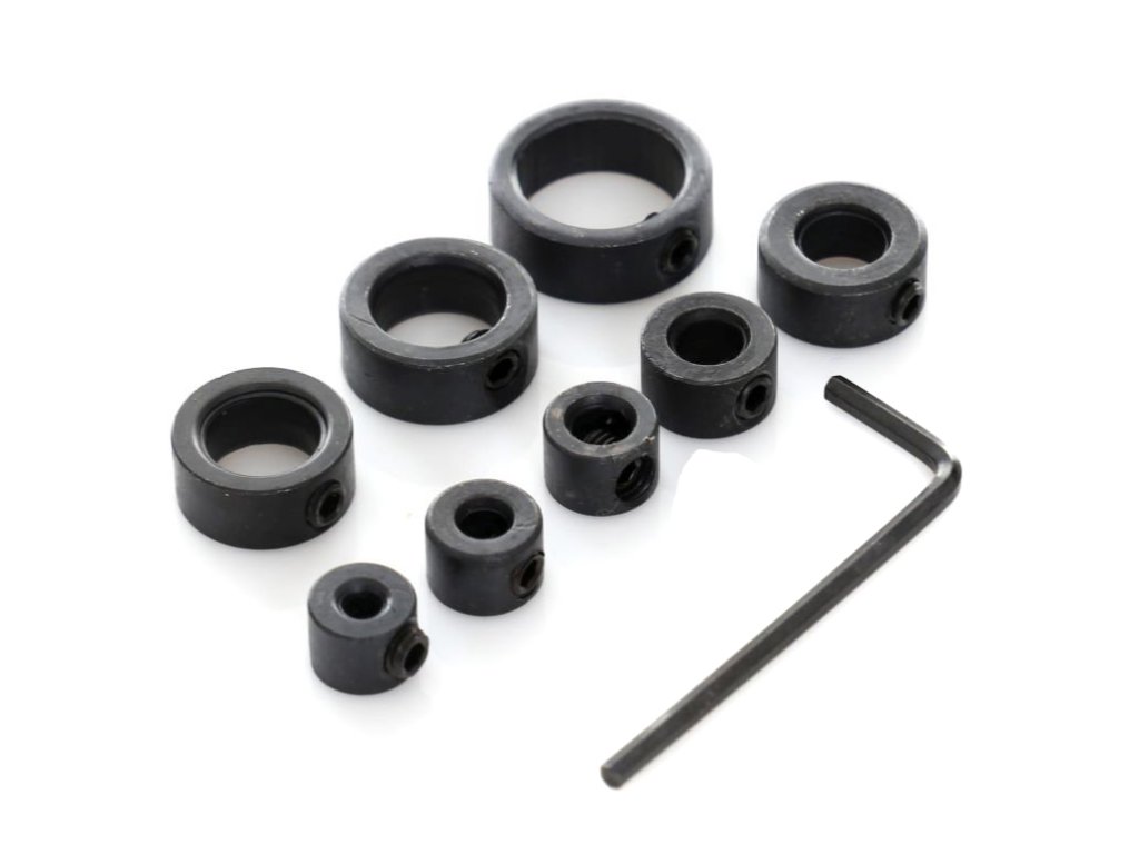 В комплекта ще намерите 8 ограничителя, съвместими със свредла с диаметри 3, 4, 5, 6, 8, 10, 12 и 16 мм, заедно с ключ за затягане на фиксиращия винт.