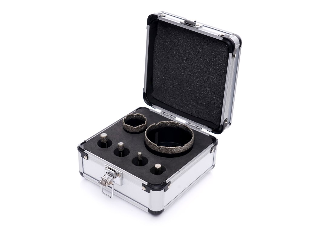 Диамантени боркорони в куфар 6 бр. KD11226 от марка Kraft&Dele, модел KD11226, предназначени за пробиване без удар – мокро в ГРЕС, керамични, мраморни, порцеланови и твърди плочи.