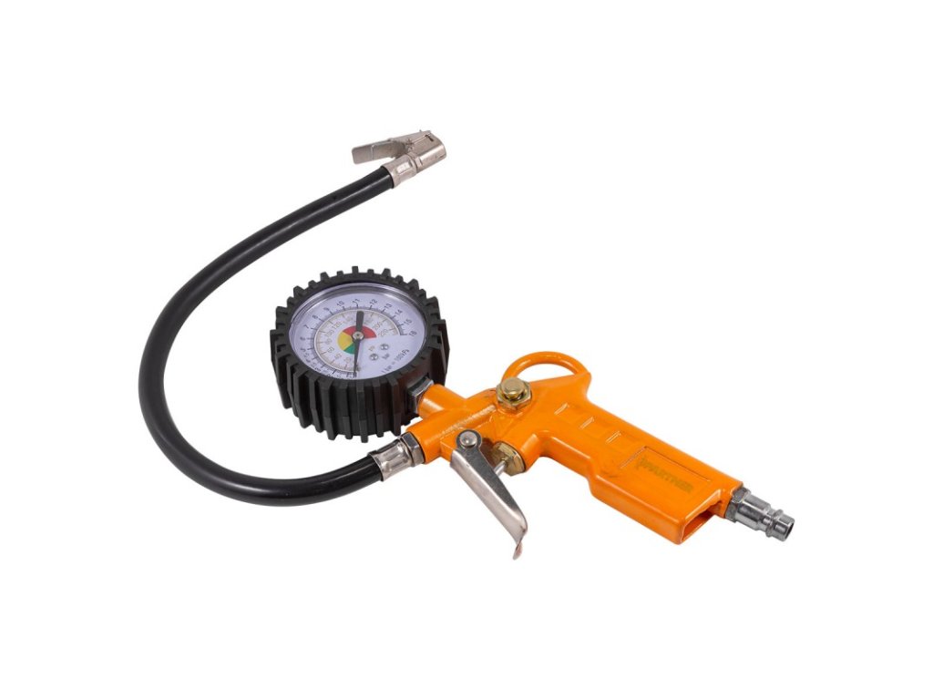 Пневматичният пистолет служи за надуване на гуми със стандартни автомобилни вентили. Оборудвана е със стандартен евро бърз конектор (1/4") , използван в европейските пневматични инструменти. Манометърът е защитен с оребрено гумено покритие, което го предпазва от повреда при небрежно оставяне.