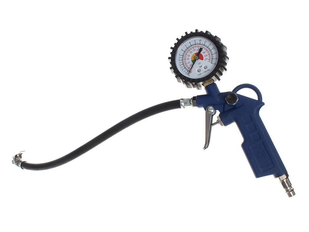 Пистолетът за надуване с манометър е идеален за надуване и контрол на налягането в гумите. Има гумено покритие на манометъра. Оборудван е с вентил за изпускане на въздуха.