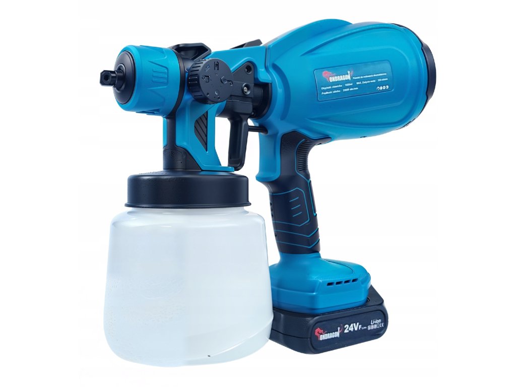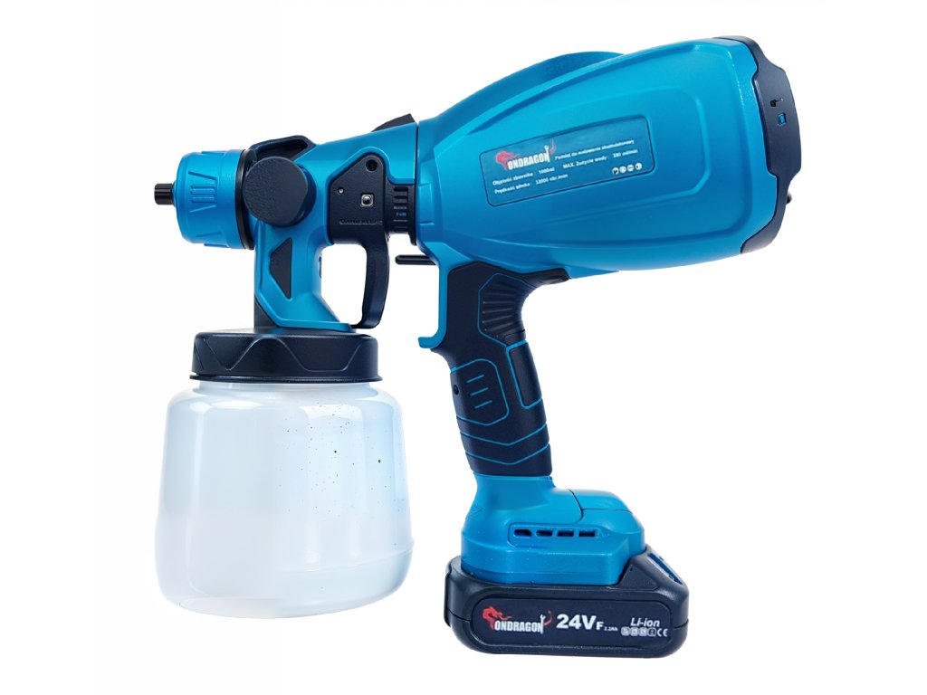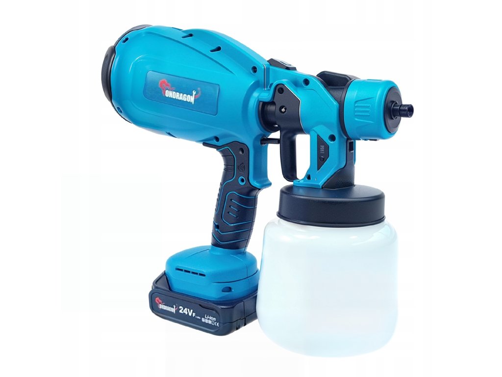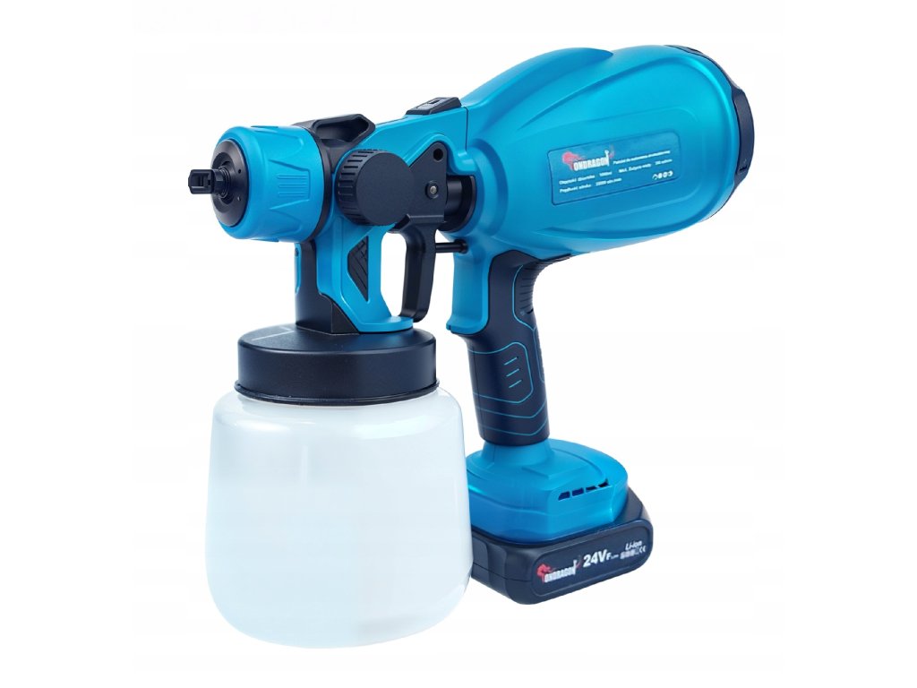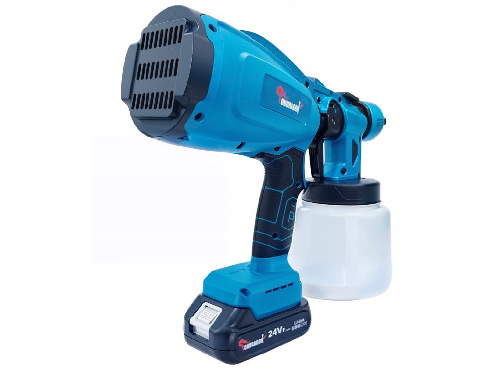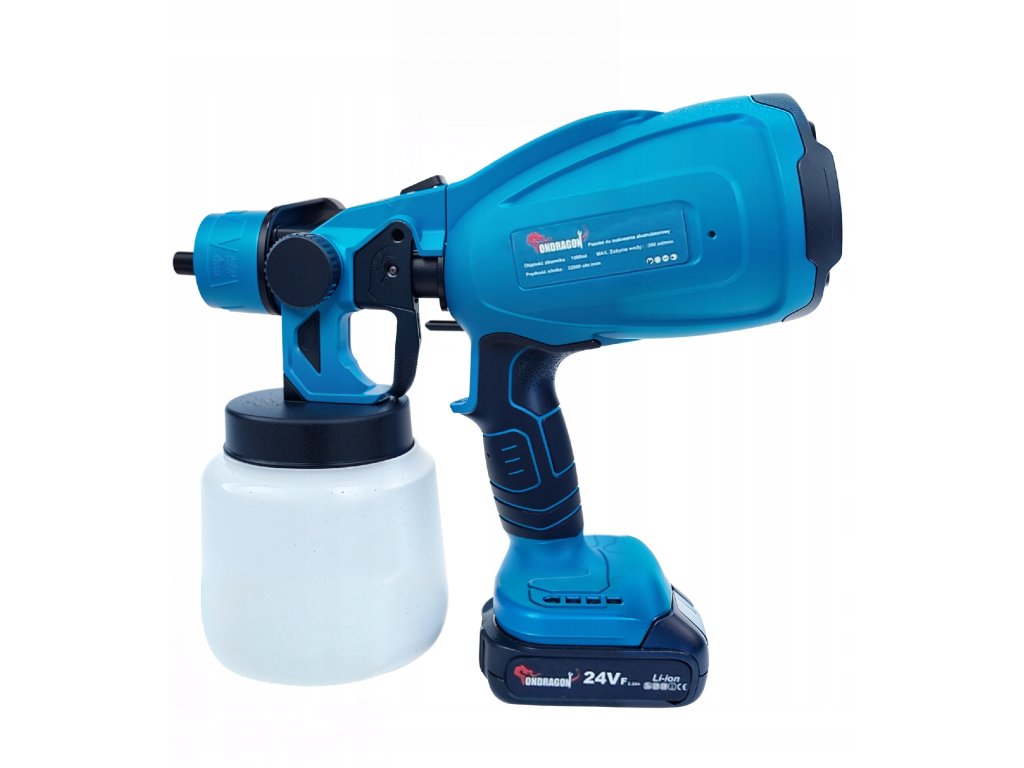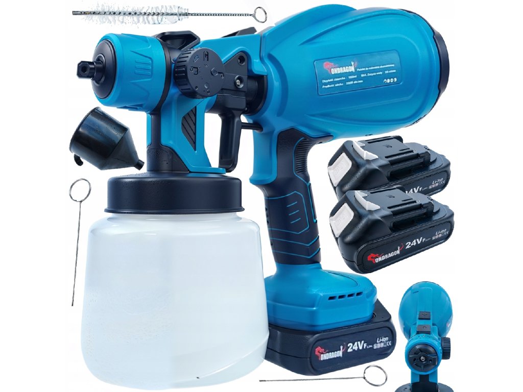 Благодарение на безжичната конструкция, може да работите без ограничения от кабели, осигурявайки максимална мобилност както в интериора, така и на открито. Пистолетът позволява нанасяне на бои с различна плътност, включително водоразтворими бои, разтворители, лакове и грундове. Регулиране на потока на боята с помощта на въртящ се бутон осигурява прецизен контрол и минимизиране на разхода на боя.
