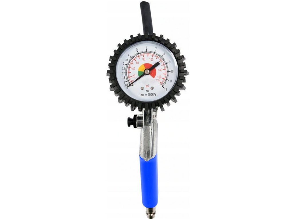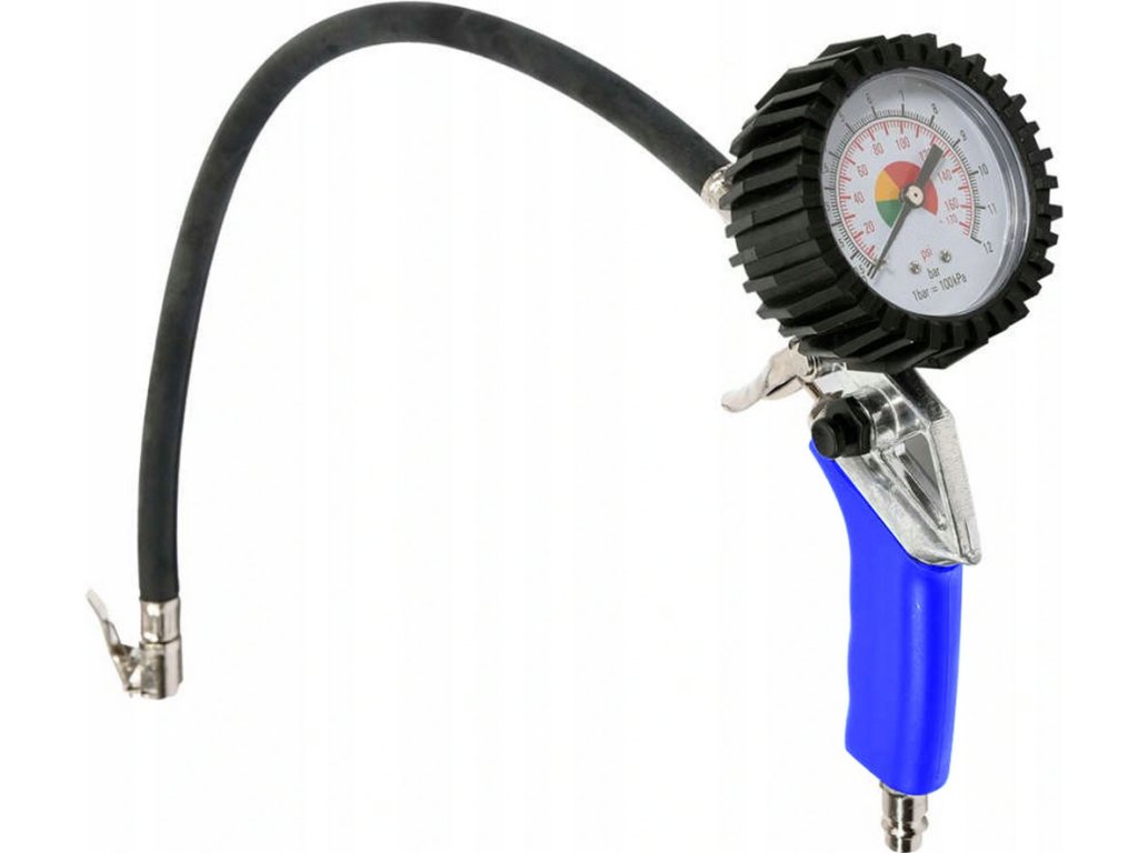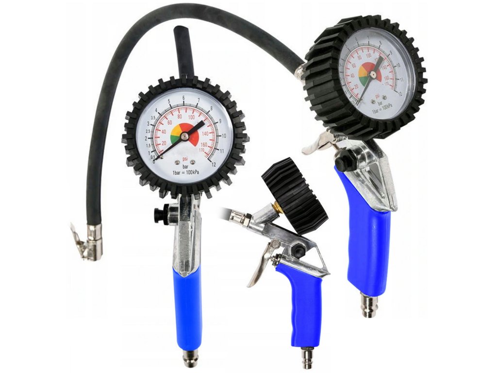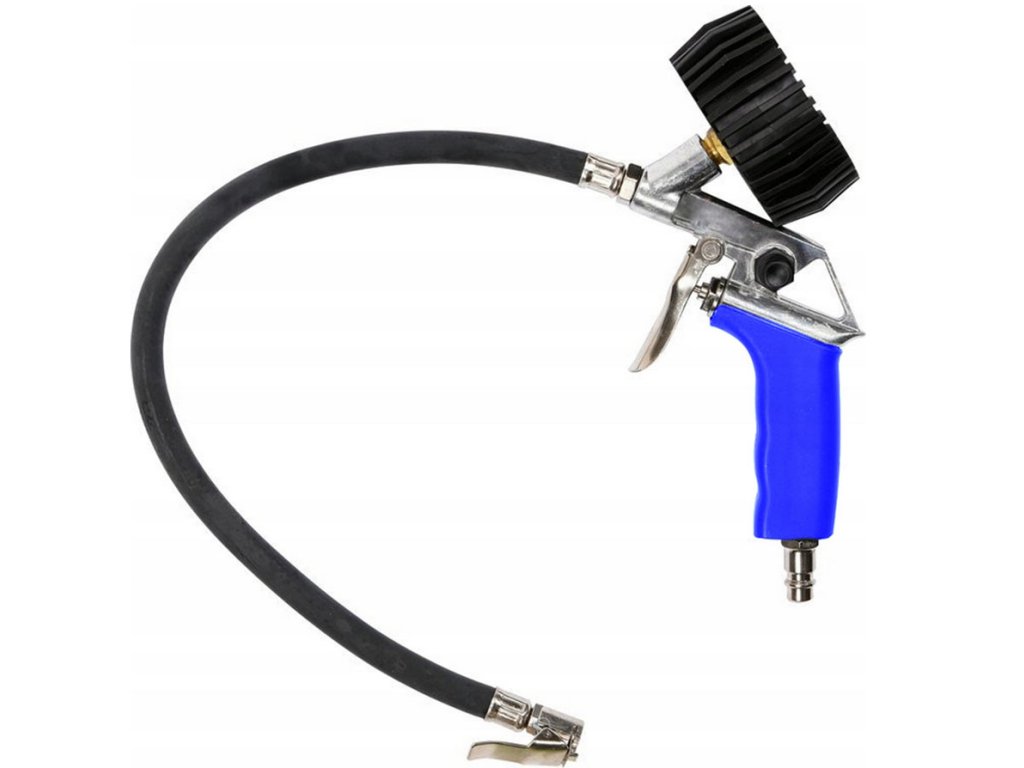 Практичен пистолет за напомпване на гуми с манометър, който осигурява прецизен контрол на налягането по време на напомпване. Този инструмент е подходящ за напомпване на гуми и вътрешни джанти с вентил. С помощта на подходящи адаптери (не са включени в комплекта) може да се използва и за напомпване на дюшеци, лодки и други надуваеми изделия. Пистолетът е изработен от здраво алуминиево тяло с антислип покритие, а манометърът е защитен с гумена обвивка.