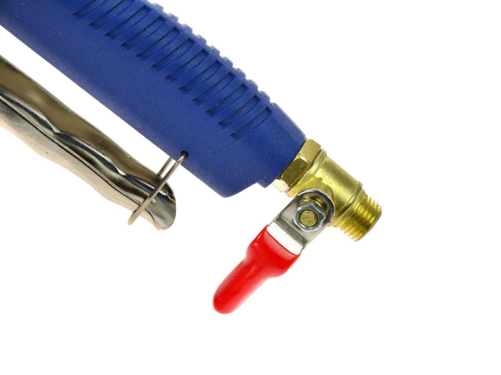 Пистолетът позволява лесно боядисване на тавани благодарение на пластмасовия съединител, включен в резервоара. Кръгъл вентил на бързосвързвателя осигурява пълно спиране на въздуха по време на работа, което подобрява удобството и контрола.