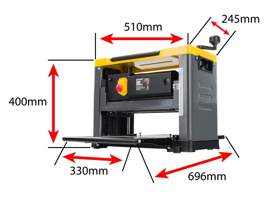 Плоскошлайф машина за дебелина с два бързорезни ножа HSS и плот с ширина 33 см, с рамена с максимална дължина 696 мм, предлага широка гама възможности и характеристики, които я правят универсален инструмент за обработка на дърво.